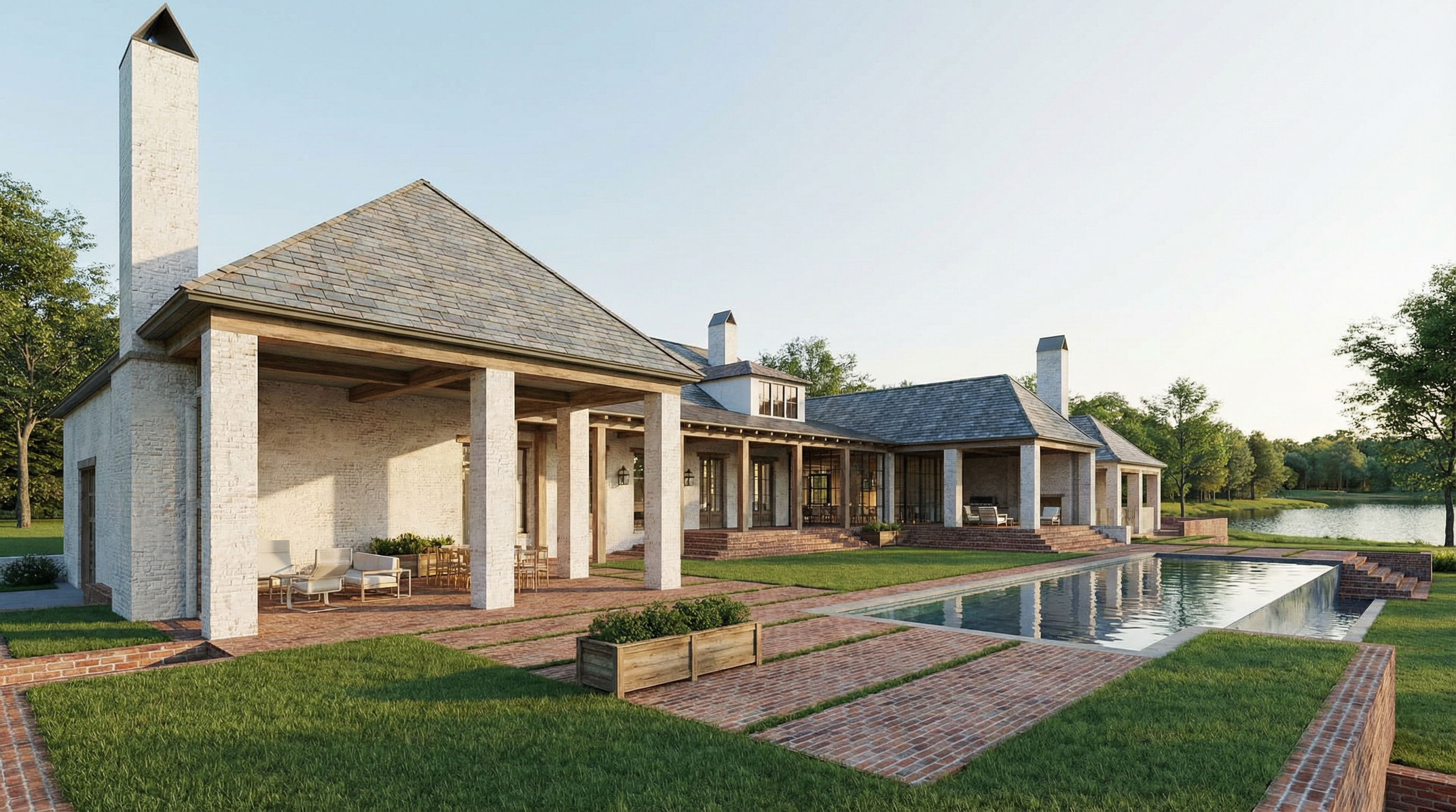 white lime washed brick manicured grass in the foreground slate roof lake and trees in the background to the right