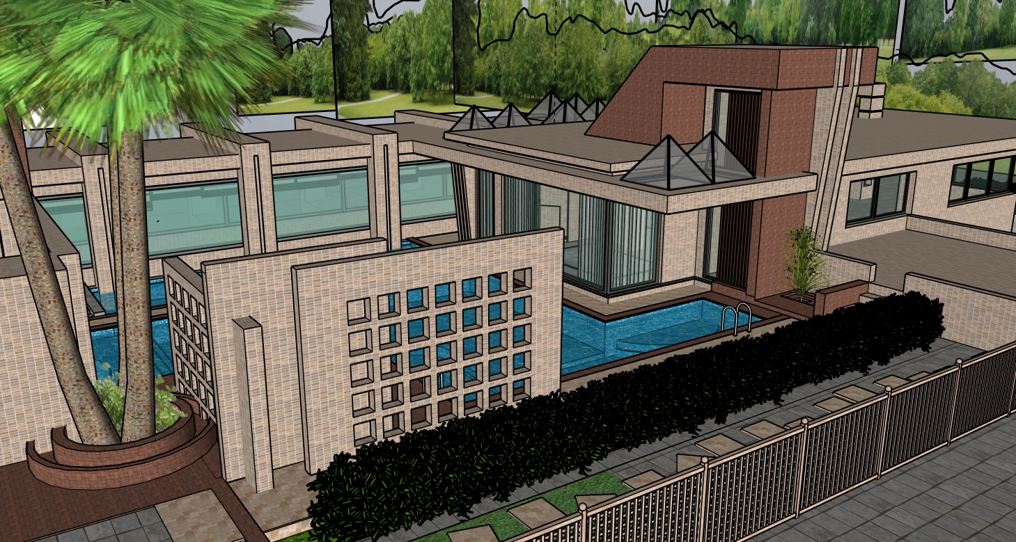 make a real render with real water in pool area show the furniture inside the house and show more houses around my design