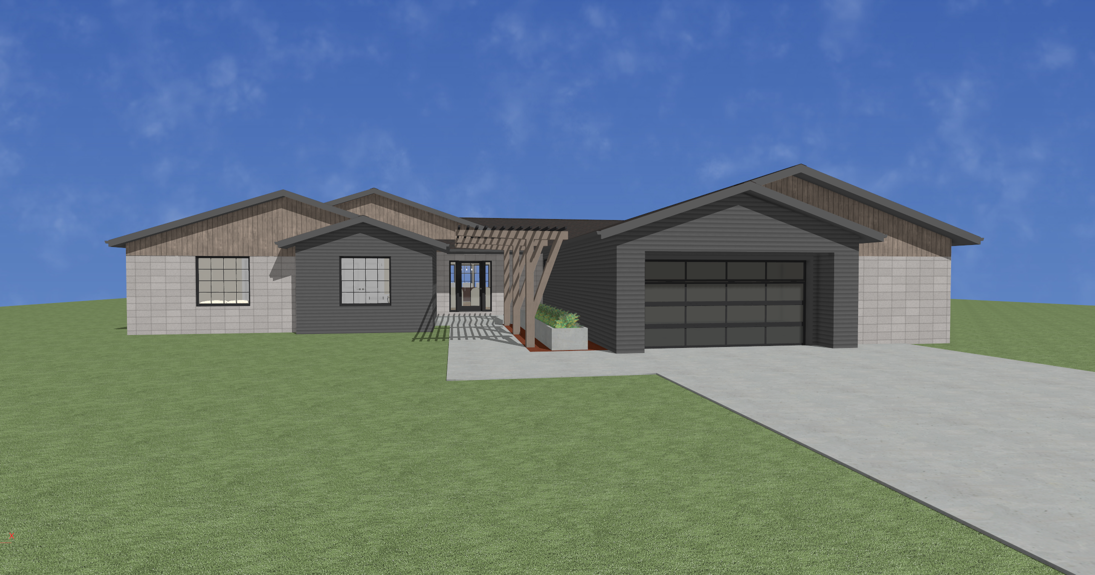show this home in a photorealistic rendering keep the exact architectural details bright evening sunlight on the front of the home and create a landscape around it