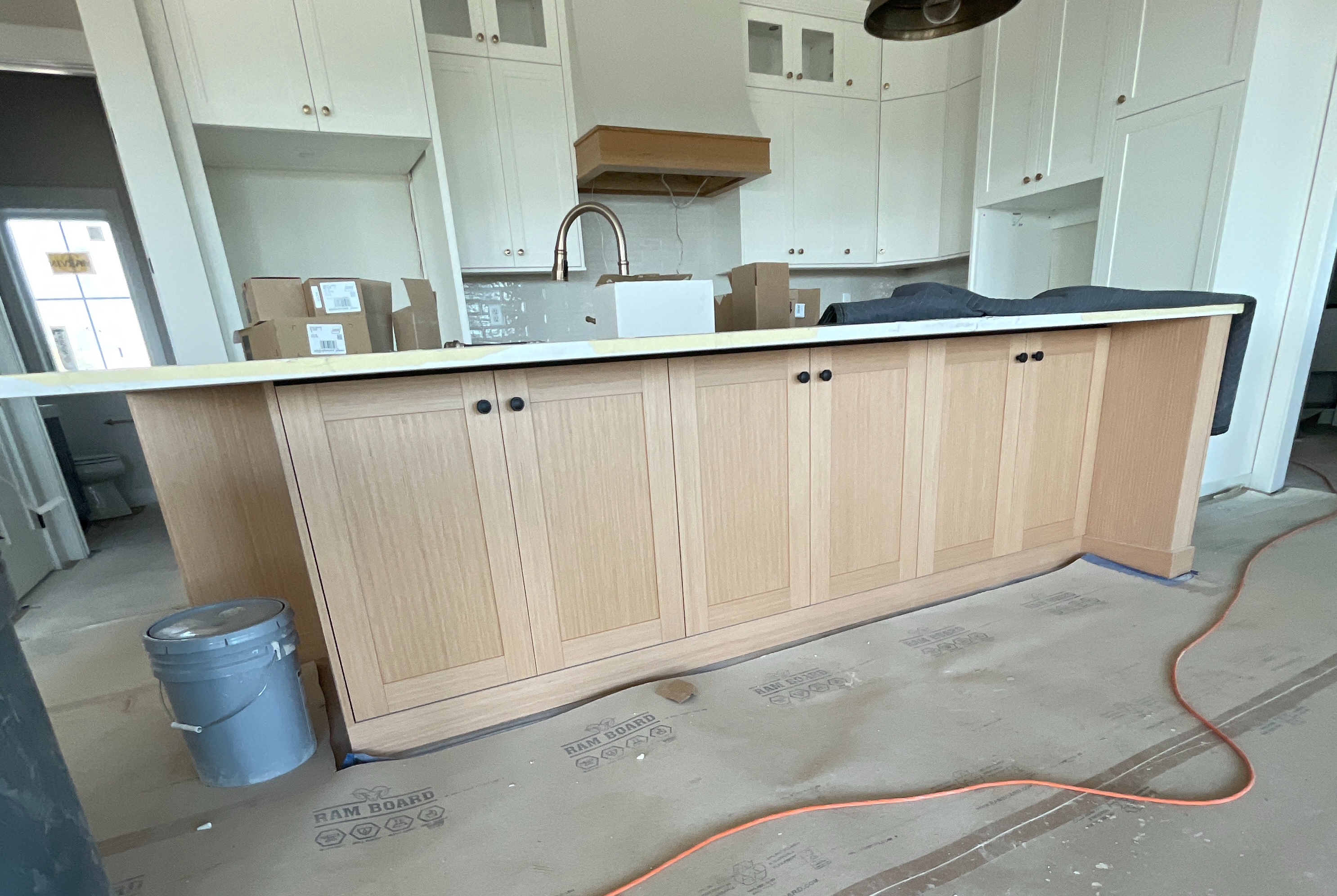 remove the cords buckets everything on the countertop add wood flooring and stage the island countertop include a couple of bar stools on the right overhang