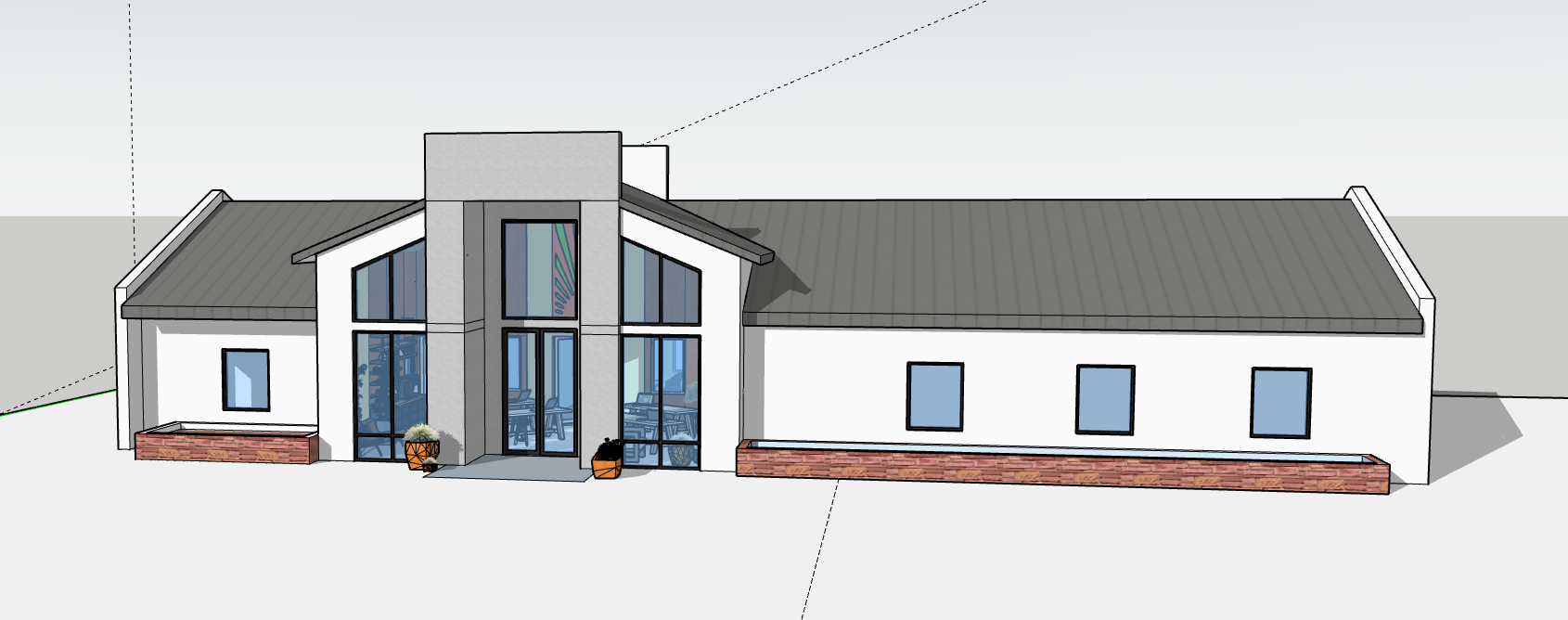 the roof and fascia is a copper color the window and door frames are black the walls are stucco with a earth tone paint the planters in the front have flagstone low walls the landscaping will be desert plantings found in the sonoran desert this will be a commercial sales office for a plant growing company civano nursery the building is located in the middle of a plant nursery show adult people cars and some loading trucks