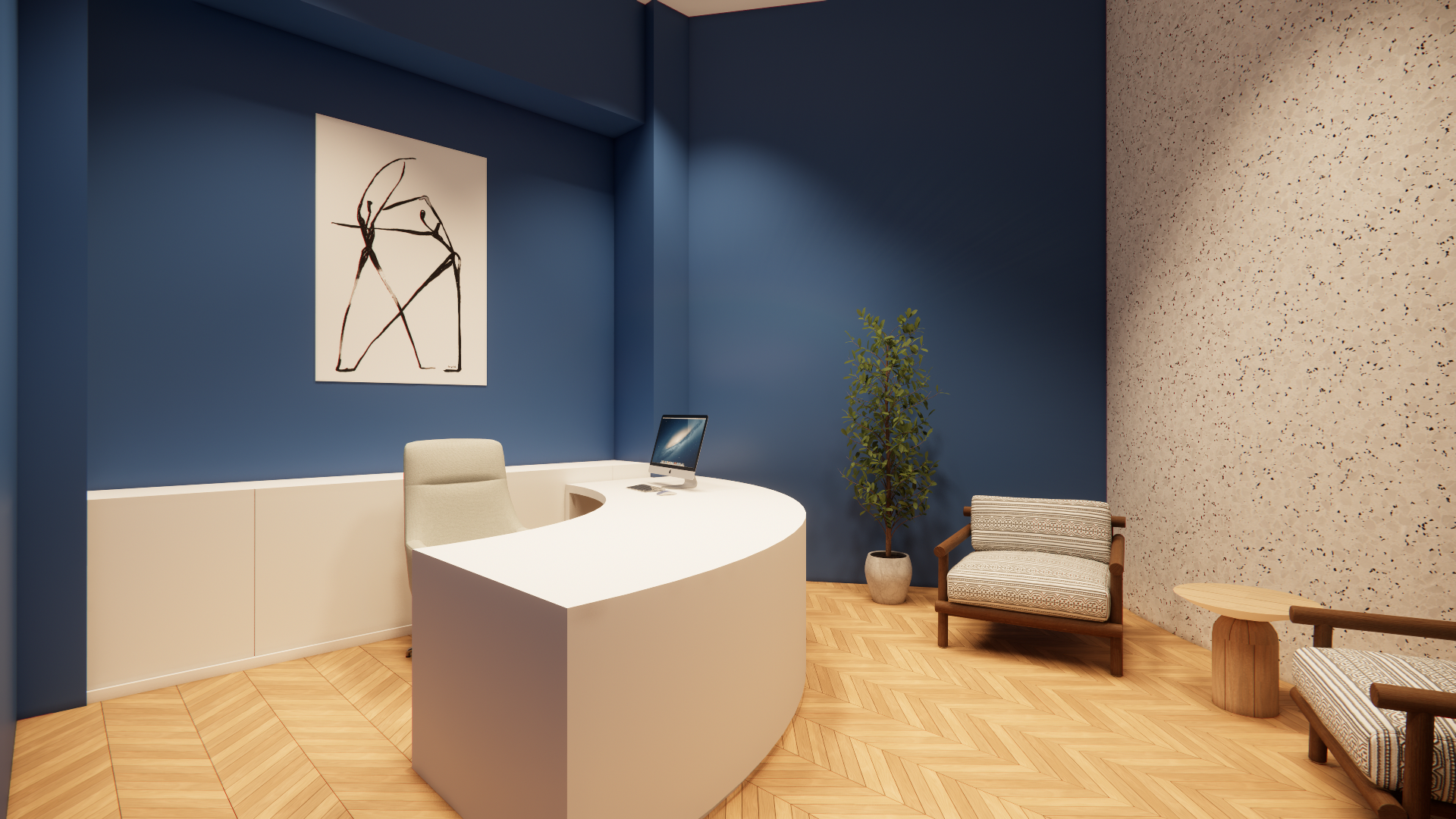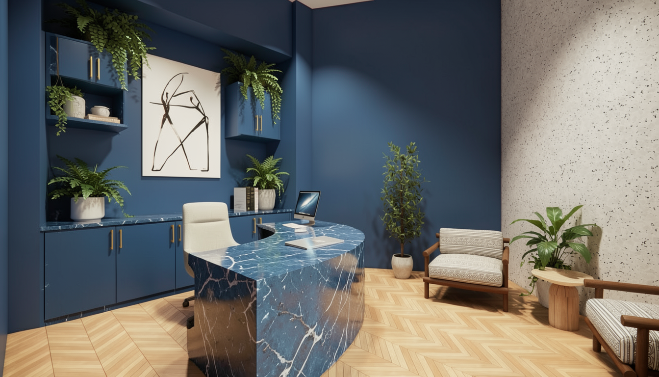 render this realistically make the cabinets blue with gold hardware and add greenery add a cool feature to the wall