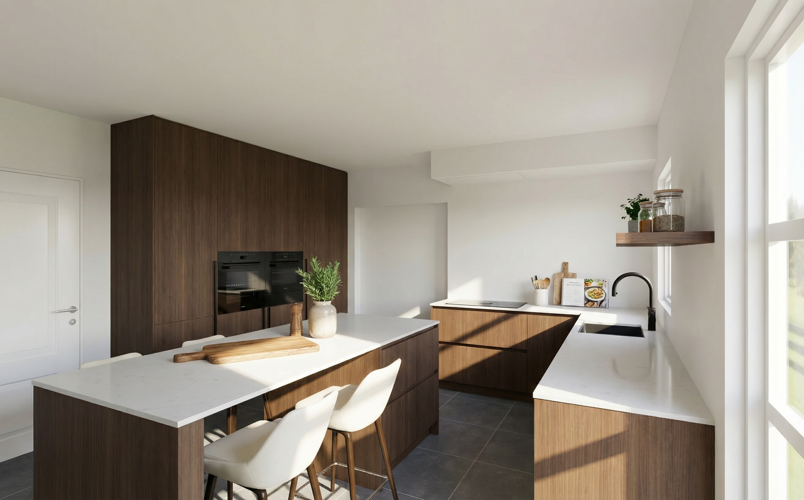 task enhance and embellish the provided building design into a photorealistic architectural masterpiece style art direction high end architectural photography archdaily editorial style 4k high resolution ultra detailed and implementation feasible components main subject a modern apartment building setting situated in a suburban moderate climate woodsy backdrop during the golden hour with long soft diagonal shadows details add physical material micro details like visible brick definition concrete pores visible panel definition and realistic reflections on glass surfaces the text on the front corner says hanover and should be maintained lighting middle of the day day lighting lighting does not interfere with natural colors of things bright sunny day with blue sky and some fluffy clouds color color balance the photo warm and cold color tone mixtures and good contrast constraints maintain the exact structural silhouette of the original design no over smoothing or plastic ai look prioritize raw unretouched texture fidelity ensure all structural lines are perfectly vertical and parallel no lens distortion add people and additional entourage to show a lively scene materials the materials on the building are very specific there is a light brick on the components at the bottom as well as a dark charcoal brick the very front corner is a grey stone material the rest of it is 3 different shades of stucco