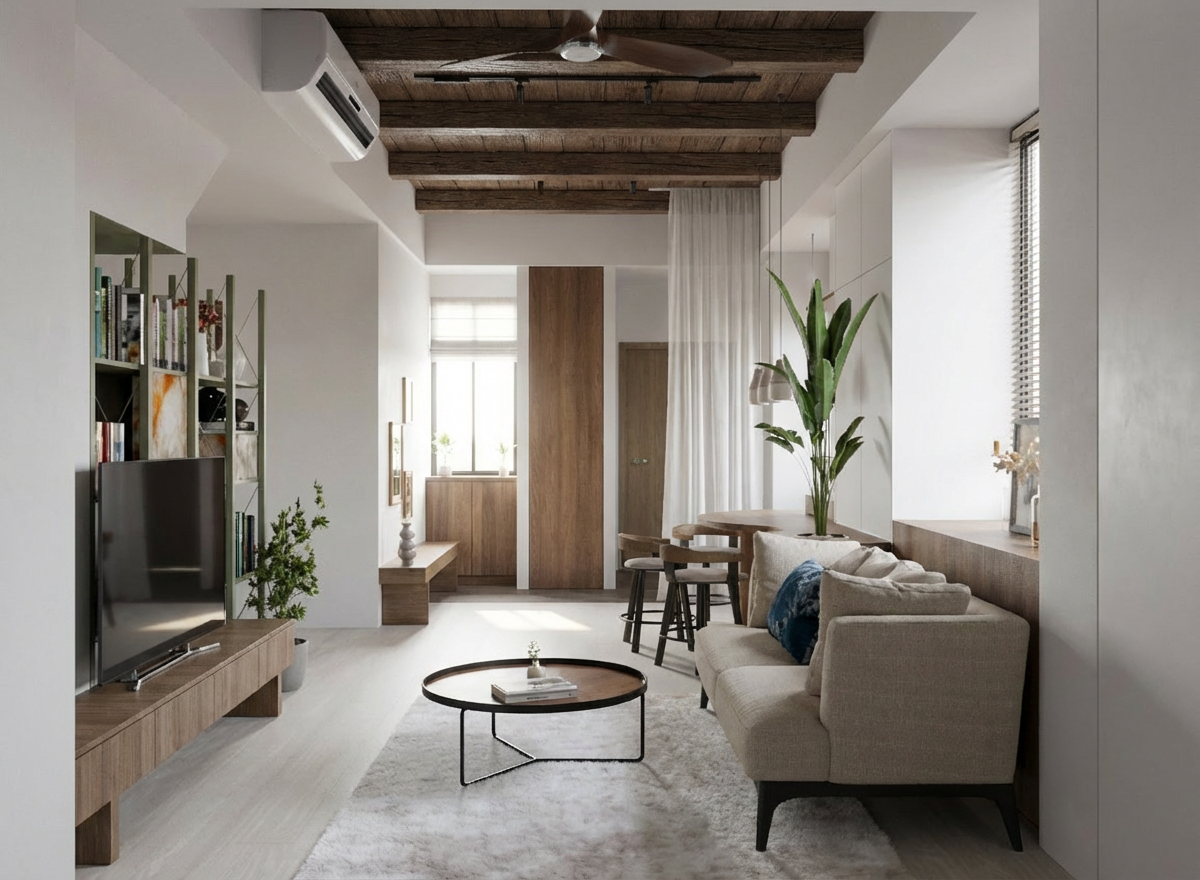 add daylight towards the living room hitting the left side of the sofa
