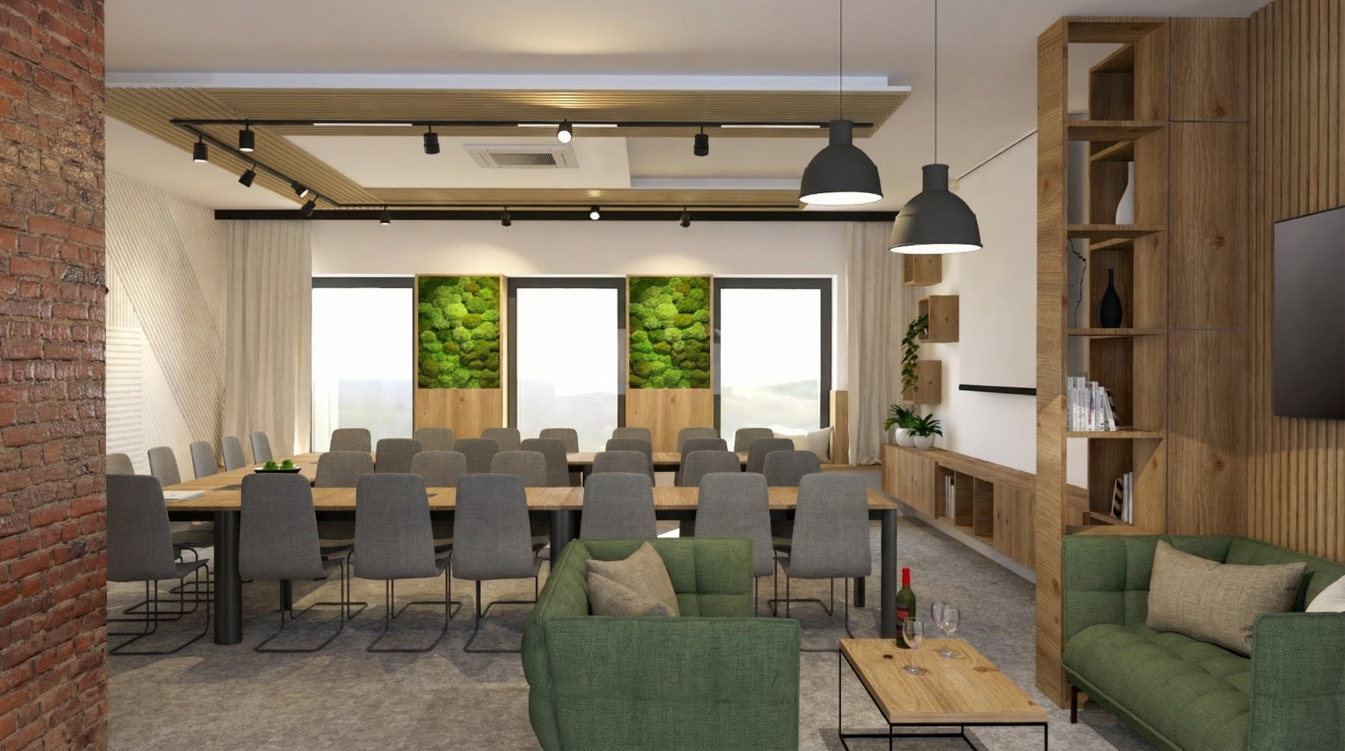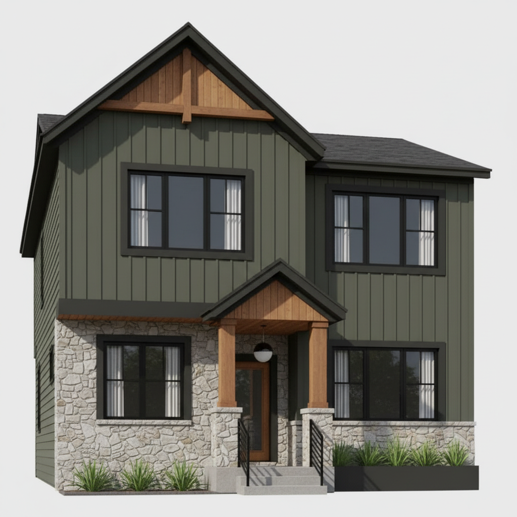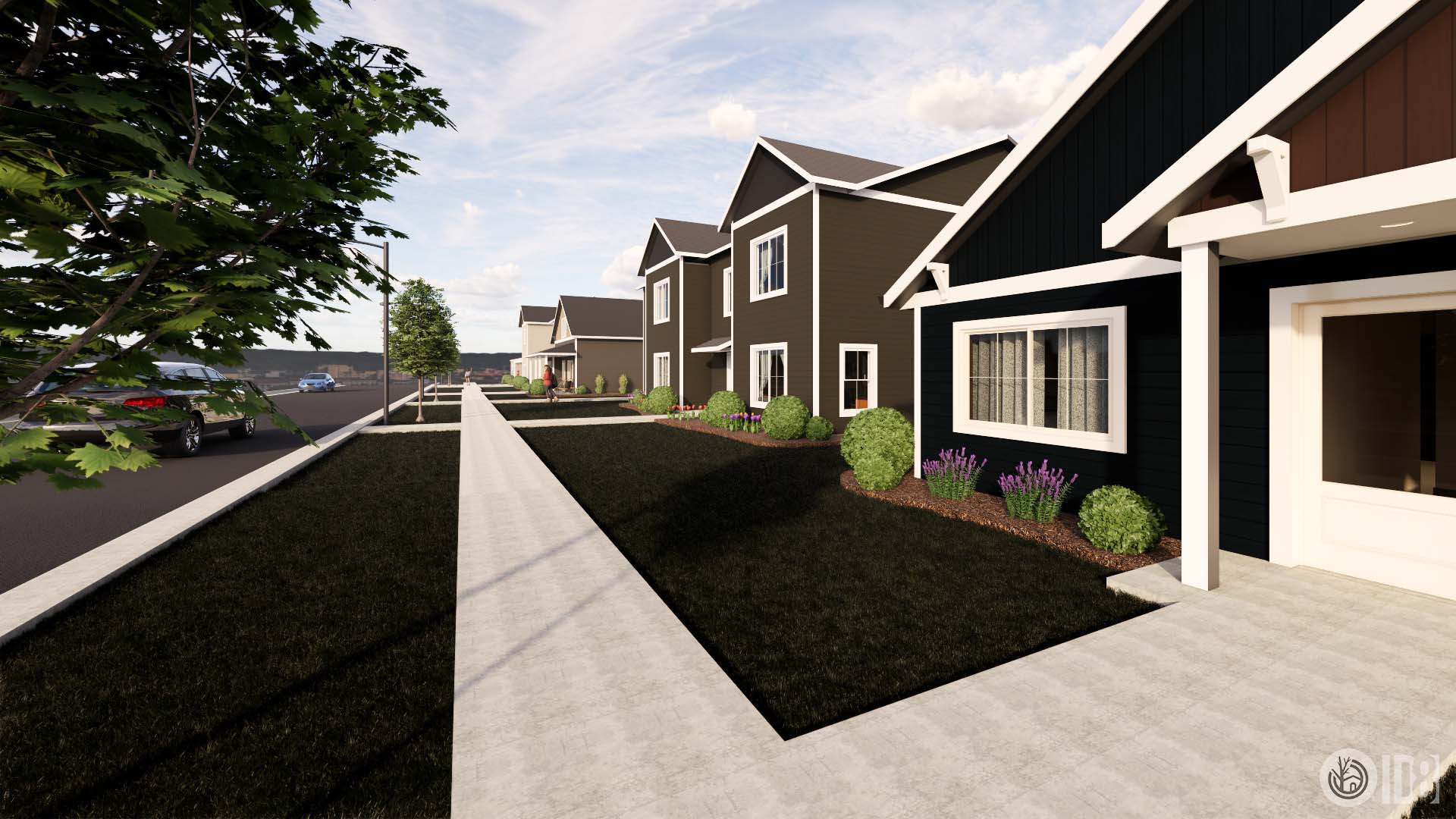make this neighborhood rendering more realistic and include realistic trees and landscaping people and cars driving down the street