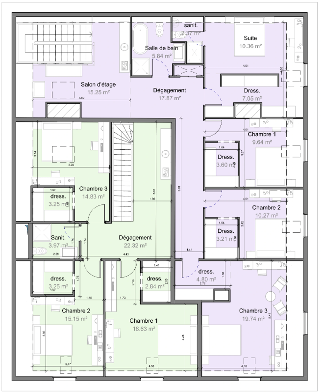 generate a 3d rendering of a modern home interior based on the floor plan use warm neutral tones such as soft beige for the walls and add wooden textures in light oak for the flooring create a cozy atmosphere with natural light streaming through large windows in the salon and sam highlighting a plush sofa in muted blue and a dining table with elegant minimalistic design add indoor plants for a fresh touch and ensure the kitchen is styled with sleek white countertops and stainless steel appliances use gentle lighting to create a warm inviting ambiance throughout the space