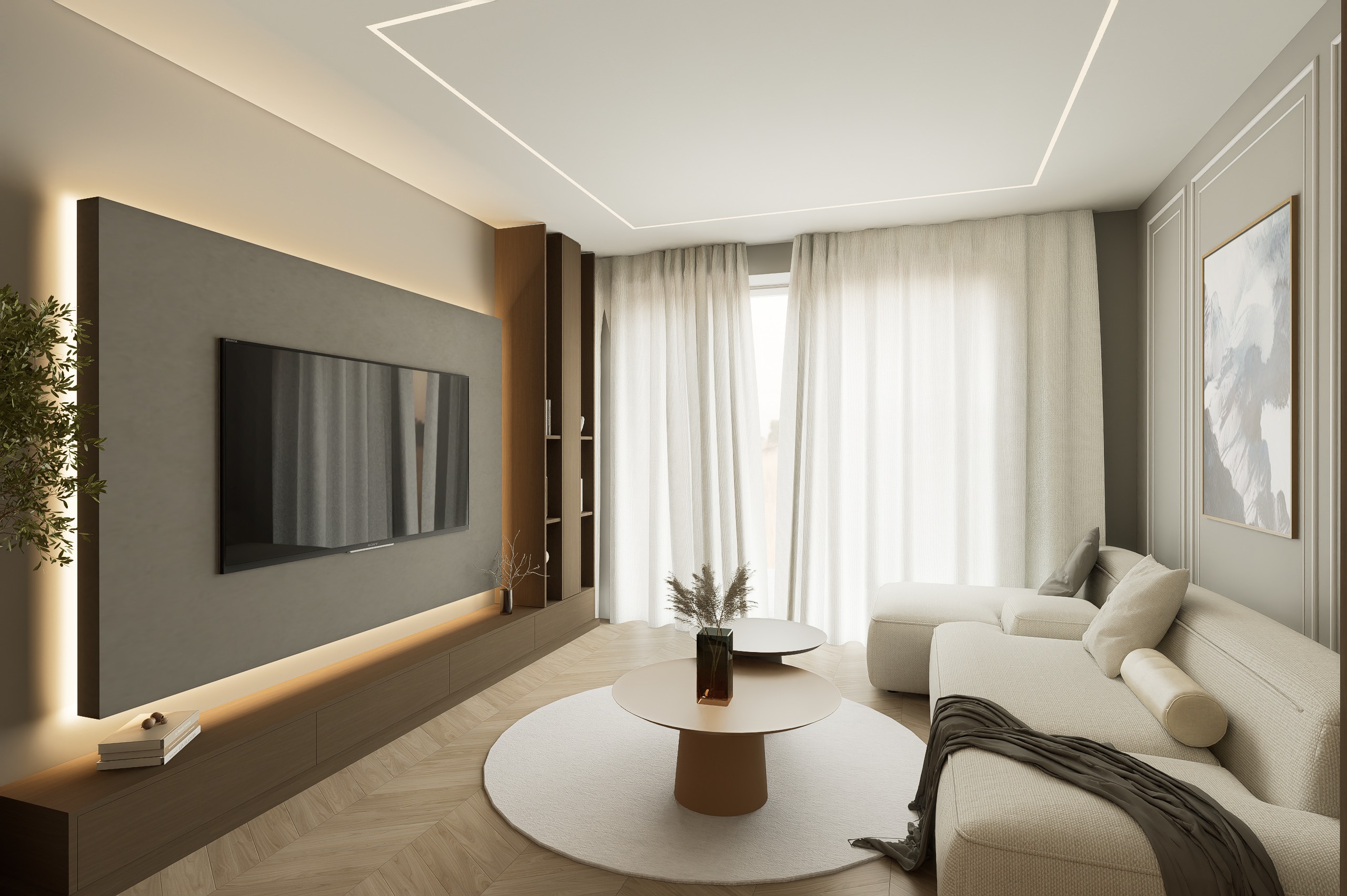 keep the exact same living room design furniture layout wall panel proportions tv wall composition shelving structure sofa shape coffee tables curtain styling ceiling detail floor pattern camera angle and overall architecture from the original render do not redesign do not move objects and do not change the composition change only the materials and finishes to match the uploaded reference image exactly the tv wall joinery long low console drawer fronts top surface vertical shelving units shelving interiors and side panels must all use a warm smoked taupe oak veneer exactly like the reference image the wood should feel deeper warmer and richer than standard light oak with a brown grey taupe undertone subtle elegant natural grain refined linear veneer texture and a premium matte finish avoid pale oak yellow oak whitewashed wood bleached veneer or scandinavian oak tones the large tv feature panel should be a light warm greige microcement or plaster finish matte soft and elegant the surrounding wall should be a deeper taupe grey decorative plaster smooth and refined slightly darker than the central tv panel matching the mood of the reference keep the led strip lighting behind the tv panel and inside the shelves as a soft warm 3000k concealed glow subtle luxurious and well integrated keep the floor as light herringbone wood but harmonize it with the reference palette using a light taupe beige oak tone soft matte and natural not too yellow keep the sofa and curtains in calm warm neutral tones maintain a high end luxury interior atmosphere with realistic shadows realistic material depth elegant ambient lighting and ultra realistic render quality important the wood veneer must match the reference closely warmer smoked taupe oak slightly darker and more sophisticated not light beige wood negative prompt restriction no pale oak no yellow wood no whitewashed veneer no bleached wood no scandinavian oak look no redesign no composition change no furniture changes no extra decor no camera change