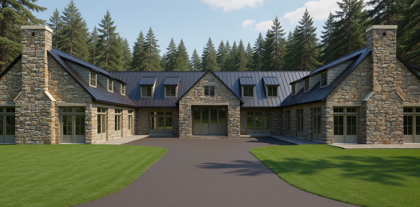 north woods natural landscaping large scale stone exterior standing seam metal roof paved driveway flagstone patios on the sides of the home natural grass where green all exterior doors and windows in pella portobello cladding note additional driveway located at front of home right of image