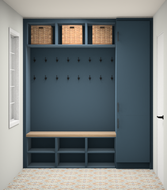 recessed lights in the ceiling shoes on shelves under the bench coats on hooks