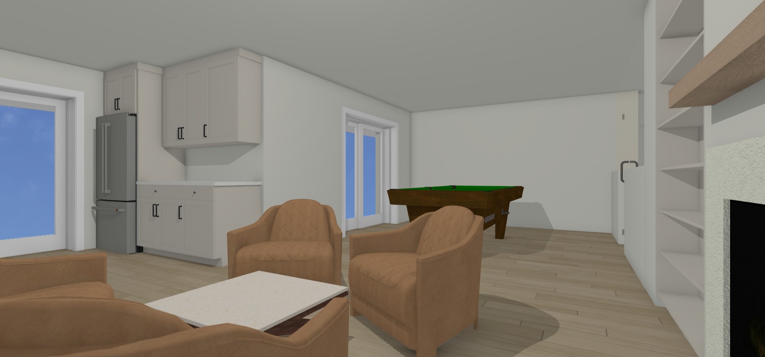 rendering shows a transitional living room with neutral walls white oak flooring with a gray undertone and lots of natural light in the immediate foreground on the left of the image are four leather chairs circling a small coffee table beyond that is a small kitchen with a refrigerator along the rear wall in the left image is a sliding glass door that opens to a backyard with grass beyond the leather chairs is a billiards room with a dark wood pool table to the left of the pool table is a sliding glass door through which a backyard with grass can be seen in the immediate foreground on the right is a fireplace with a limestone surround and a white oak mantle beyond the fireplace is a bookcase painted a neutral off white with a scattering of books on it light streams through both sliding glass doors image is 8k and hyperrealistic
