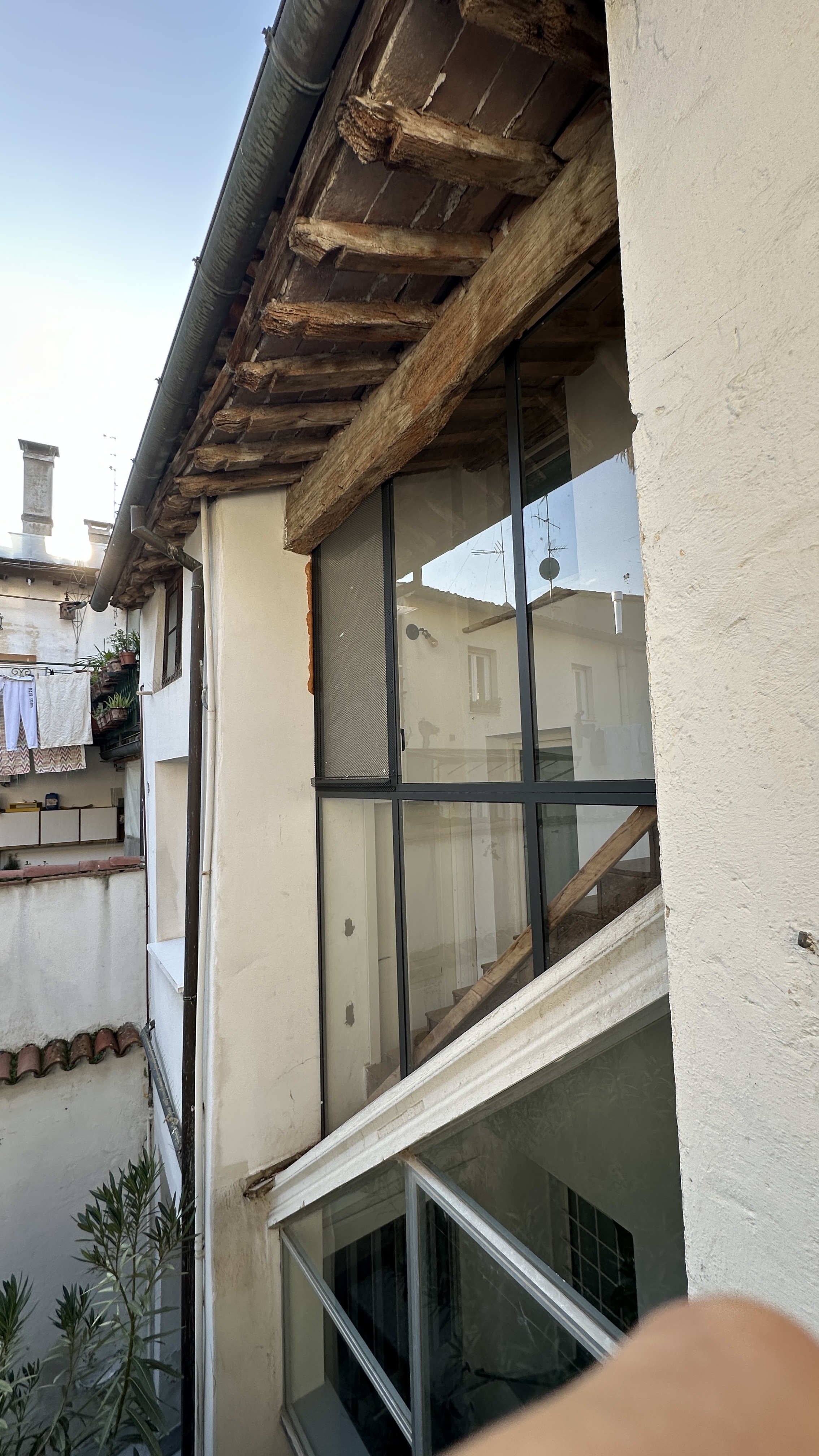 ricopri l elemento in cemento bianco in pendenza con un carter in lamiera color grigio antratice come il telaio dell infisso nella parte alta della scala poi elimina l infisso nella parte bassa della scala e sostituiscilo con un infisso uguale per tipologia a quello della parte alta della scala