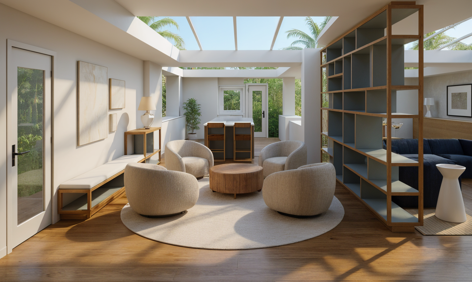 mediterranean revival exterior shot apply a light greige smooth stucco to the exterior a dark bronze metal overhang dark bronze window frames and a white oak vertical paneled front door with white oak trim the box along the windowless wall should be a neutral flagstone with pampas and wispy plants inside add a wood plank pathway to front door and modern mediterranean landscaping architecture