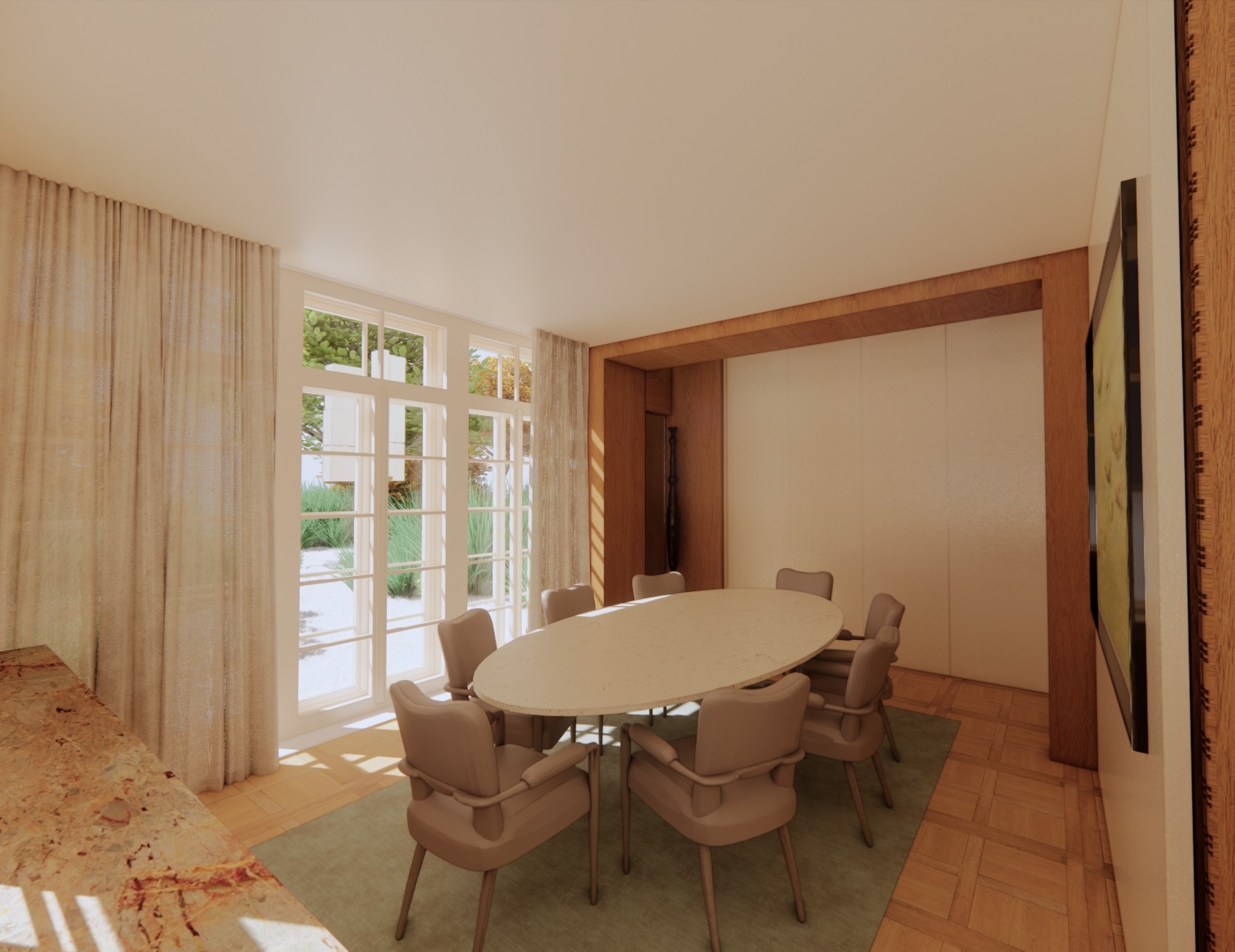 change the materials of the chairs around the table using soft creme boucle fabric on the backreast the seat and the armrest pads and using the same oak veneer as seen on the arch on the chair tubular structure the rest of the image stays the same