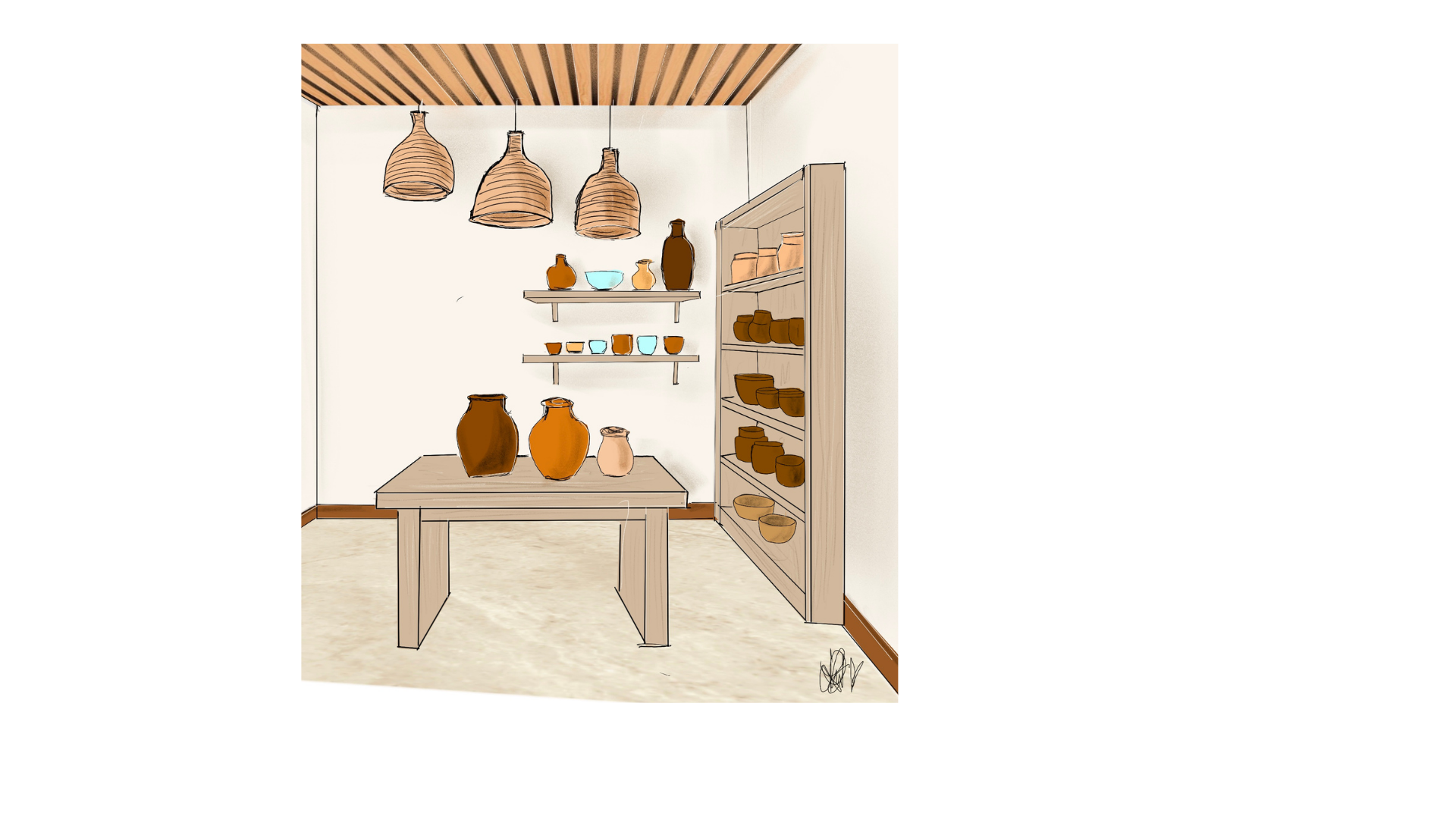 add marble flooring rattan pendant lighting and this is in a retal store an artisan area for teaching potery
