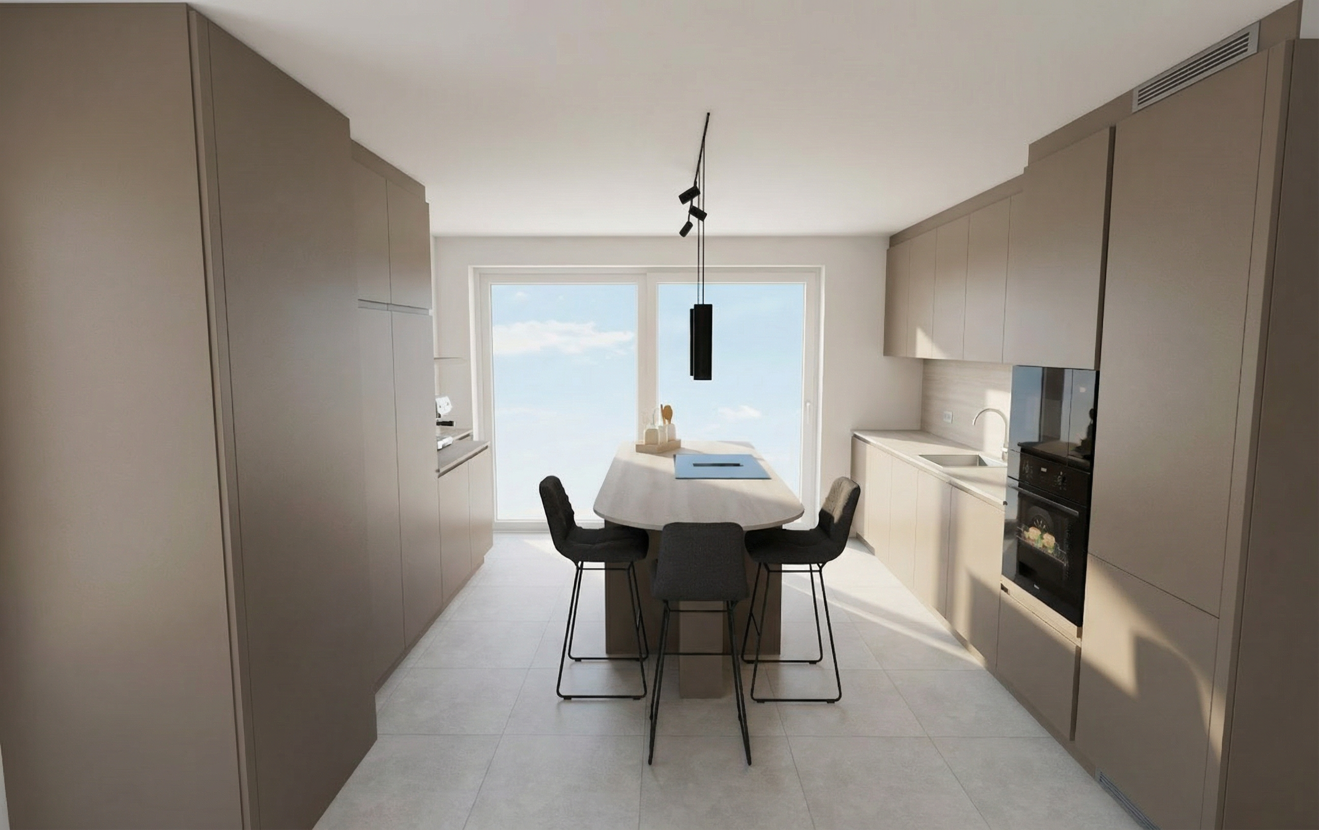 transform the provided interior image into a high end photorealistic render with soft glowing highlights and relaxed upscale energy while keeping everything exactly the same same proportions same seating same ceiling same wall finishes same materials and same spatial configuration do not move or alter any objects geometry textures colors or furniture positions all objects throughout must remain exactly in the same locations and proportions on the left windows only provide nyc building views from 44th floor in the middle of midtown new york city in the morning 10am strong cool light do not change people