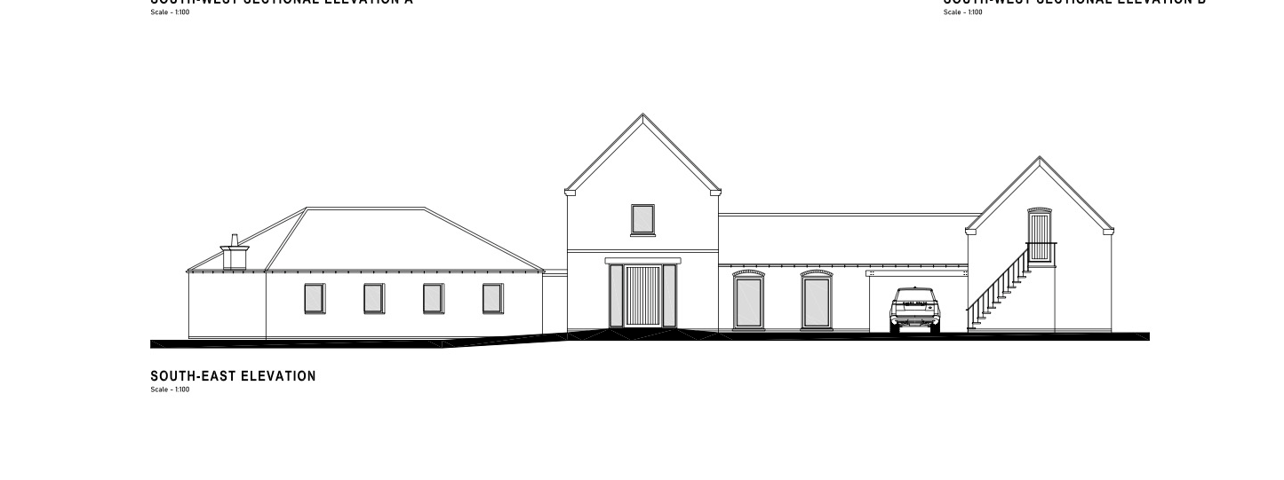 light reclaimed brick property with stylish roof crittal windows in a neutral colour where the car is position this is a car porch and is open just a roof over the car no wall behind it left building is angled away 7m x 12m right buildling with steps is a triple garage