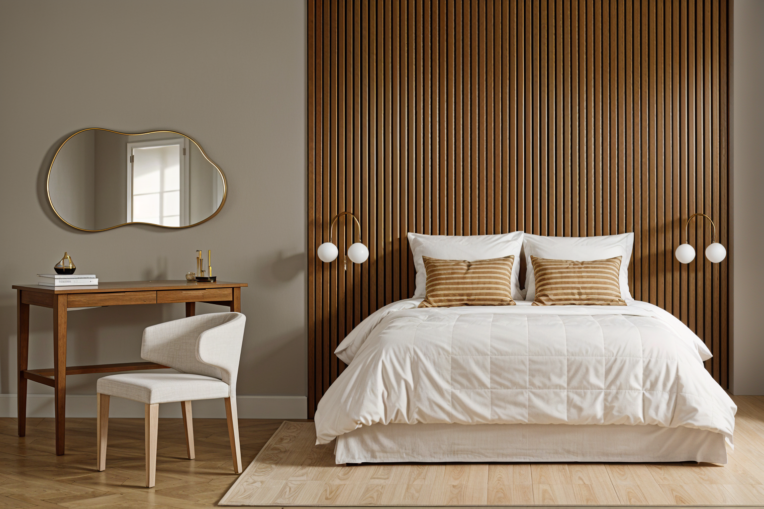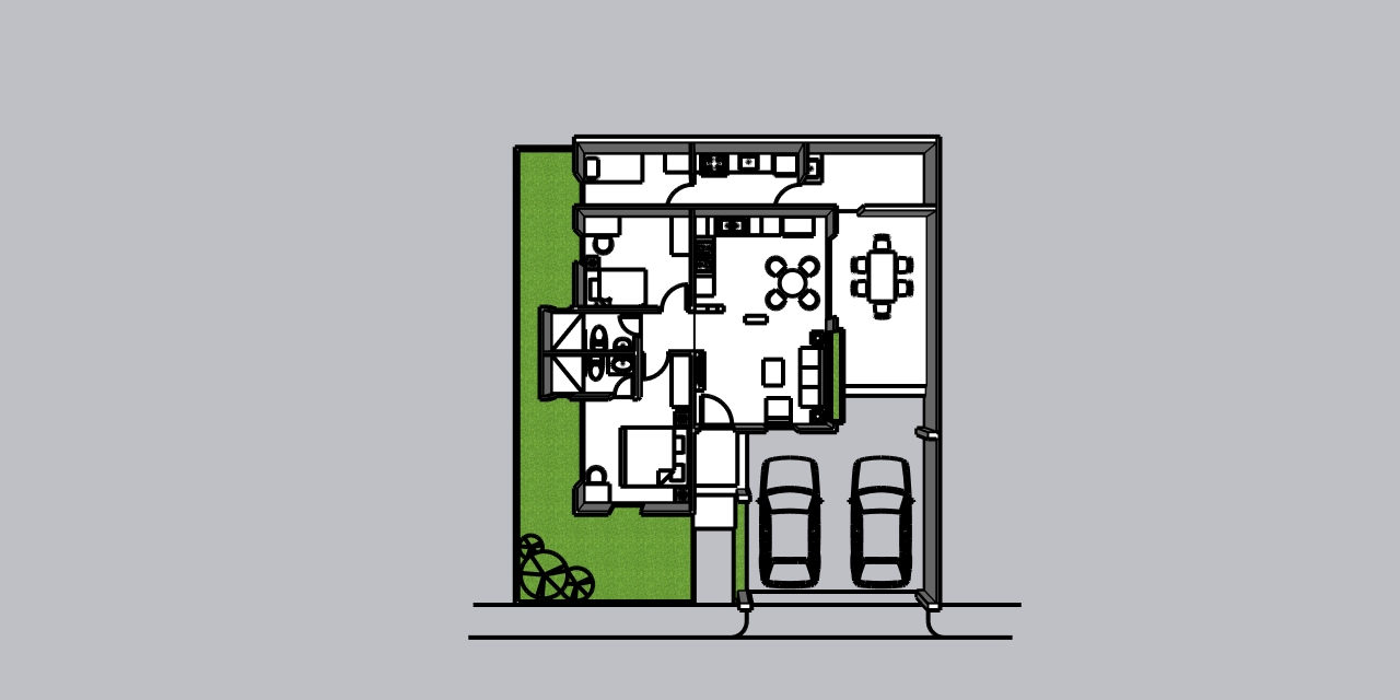convert this architectural plan into a realistic 3d top view render use 60x60 cm light gray floor tiles consistently across all indoor and outdoor spaces add plants in all planter boxes and create lush landscaping with grass shrubs and small trees around the house perimeter include cabinets with visible folded clothes in the master bedroom and bedroom 1 and a bed in the helper s room add stair steps at the porch and also steps leading up to the outdoor dining area to show elevation change maintain a modern tropical design style with white walls warm wooden accents and soft daylight lighting render in high photorealistic quality showing realistic materials textures and soft shadows
