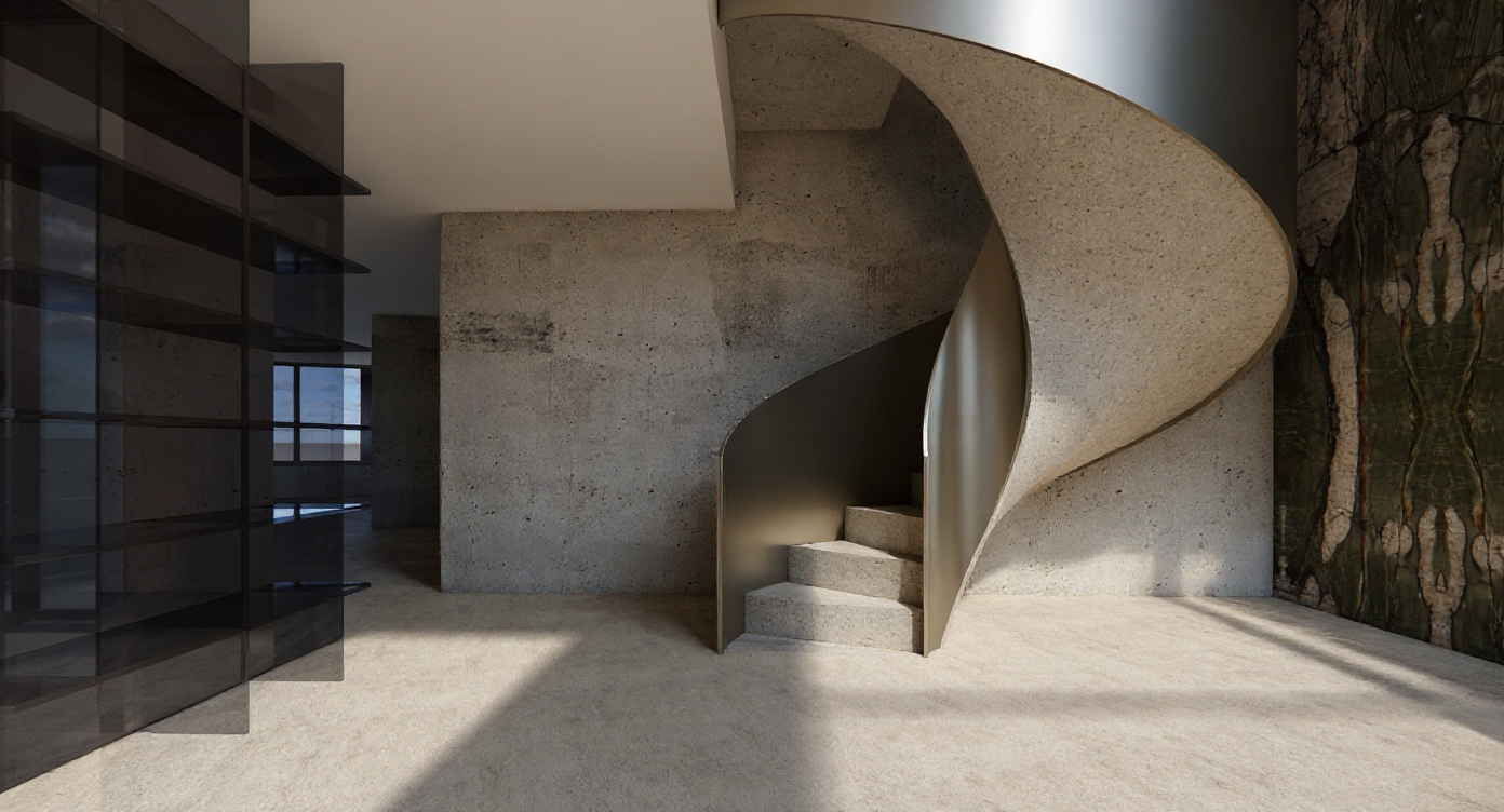 do not change any architecture geometry layout camera angle planter positions vegetation arrangement lighting fixtures or structure maintain the exact scene enhance realism only concrete columns light warm gray with subtle surface variation fine micro texture natural mottling matte finish no flat smooth surfaces steel i beams joists and trusses crisp slightly reflective blackened steel with accurate global illumination and shadow depth metal roof deck sharper ribbed texture realistic specular highlights softer bounce light wood planter boxes and seat backs darker walnut wood with visible grain slight variation board to board realistic matte finish no gloss upholstered bench cushions soft warm taupe leather vinyl with light creasing stitching detail and gentle specular response still subtle not shiny plants high fidelity foliage with depth translucency and natural variation not uniform or flat tables chairs refined wood grain more natural reflections on tabletops subtle edge wear glass curtain walls increase reflections gently subtle environmental bounce no distortions floor polished concrete with slight specular variation soft reflections micro texture and natural imperfections overall atmosphere soft diffused daylight mildly desaturated color palette for realism balanced contrast deeper shadows and more depth between foreground and background no bloom or hazy glow unless naturally occurring do not add people or additional objects render as an ultra realistic high end architectural visualization