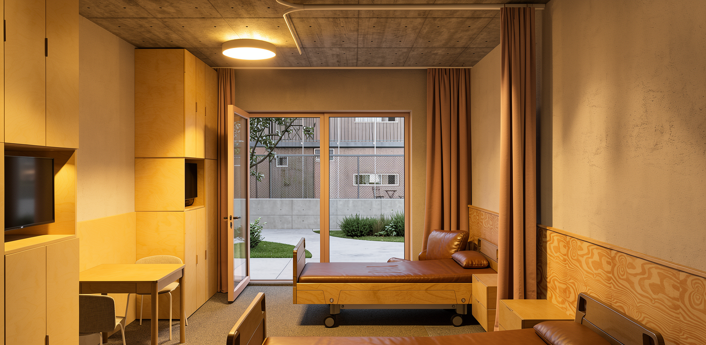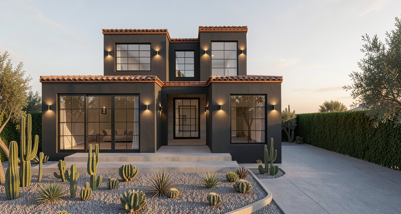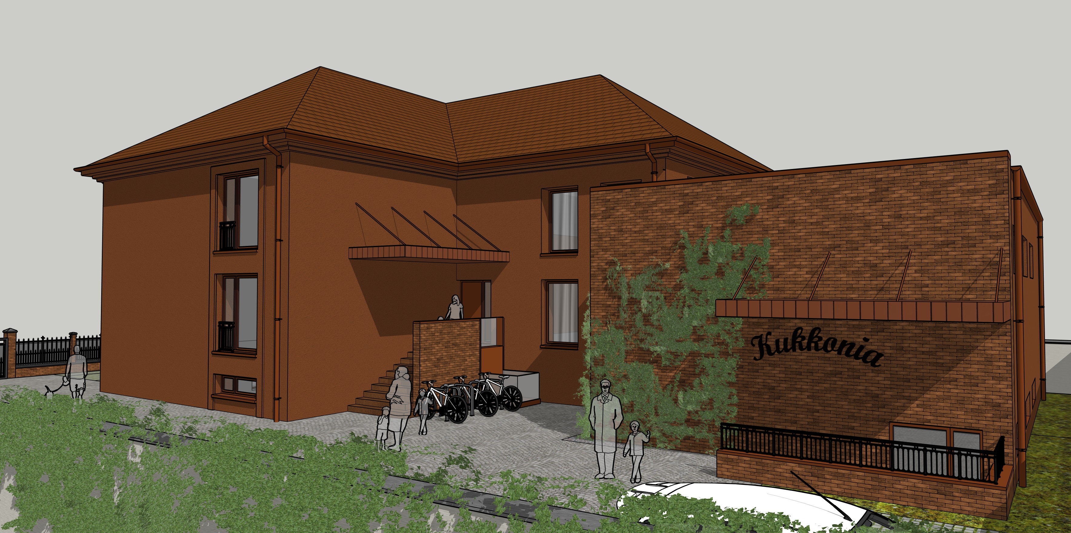 educational building render a photorealistic 3d perspective of this house reference the current material style just enhance them flat ceramic tile roof plastered walls keep model geometry the same windows doors roof walls make a lush vegetation that looks native ca do not change the view only enhance the current materials and make the landscape nicer vegetation detailed textures in the wood siding and glass reflections and a vibrant clear sky with light atmospheric depth render in hyper realistic architectural visualization resolution surrounded by a lot of trees kids an parents inside and on the streets climbing plant