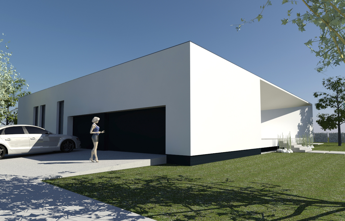 do not change the shape and volume of the building apply architectural concrete plaster in anthracite color on the facade add trees bright natural sunlight at 10 am soft realistic shadows blue sky with scattered clouds calm village atmosphere