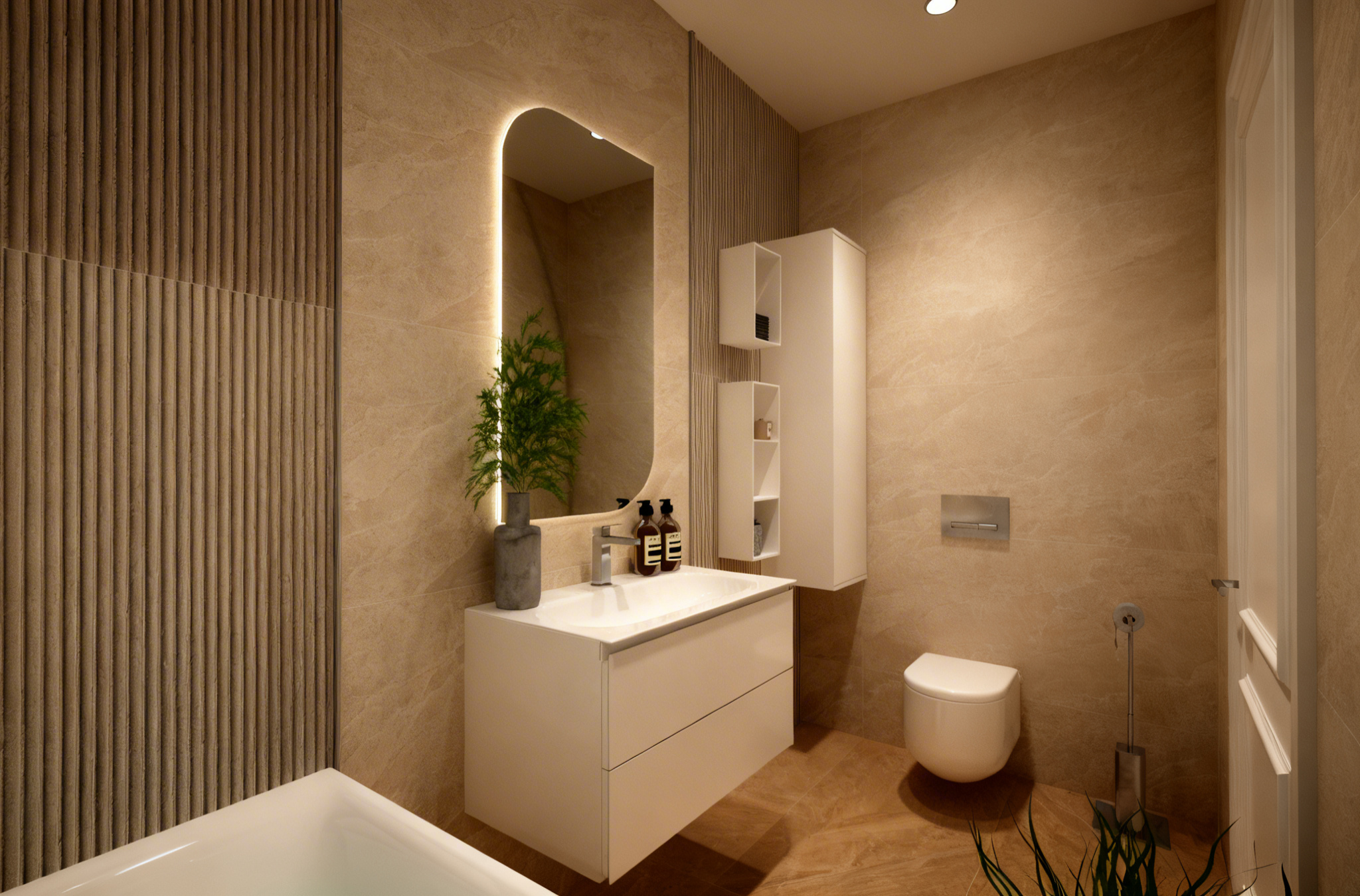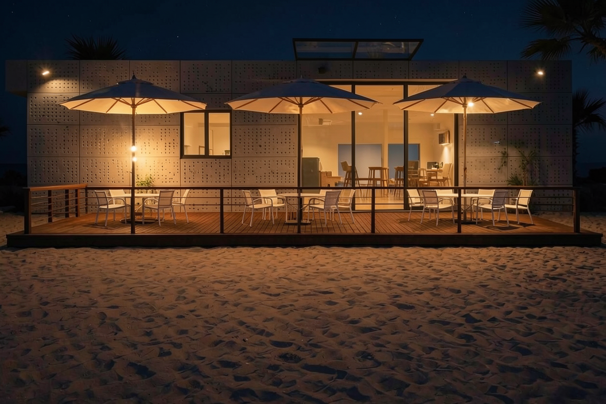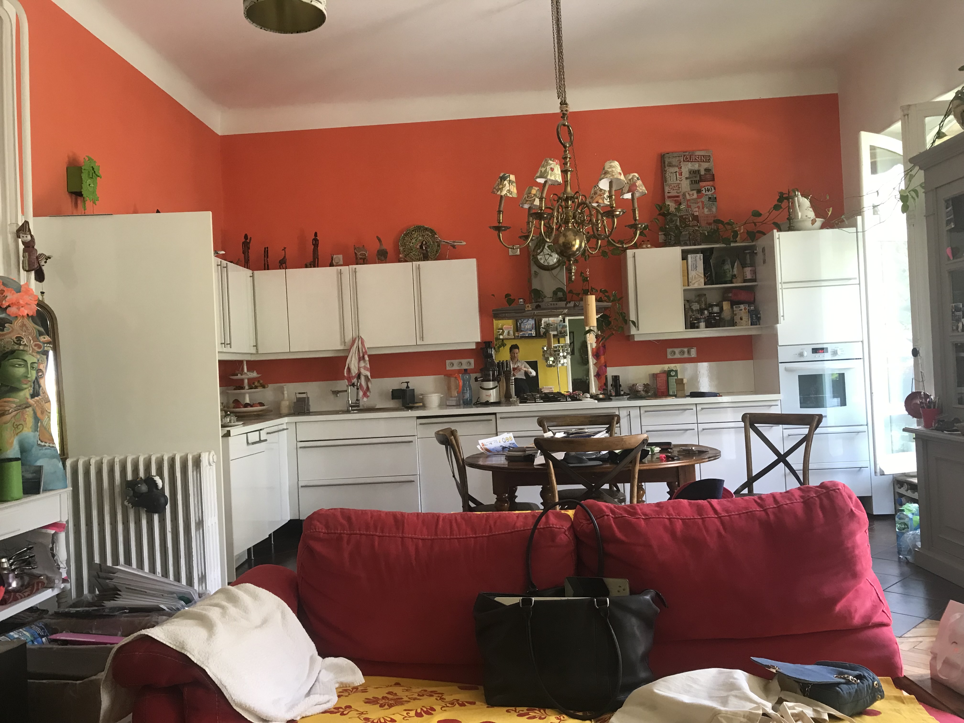 cinematic natural golden hour light flooding a spacious mediterranean apartment wide angle shot of a living room with high ceilings and ornate modernist staff moldings with shadow gaps figuring geometrical motives like a jardin le n tre large open french windows revealing a seamless transition to a sunny terrace noble materials featured wire brushed dark honey toned solid oak cabinetry and polished ivory terrazzo floors and flush terrazzo baseboards with double shadow gaps single linen semi transparent curtain blowing in the breeze on the whole surface of the french windows except where taken aside by breeze thick carpet according to the room proportions hyper realistic architectural photography real filtered light soft shadows airy and sophisticated mood high end real estate vision calm and refined atmosphere