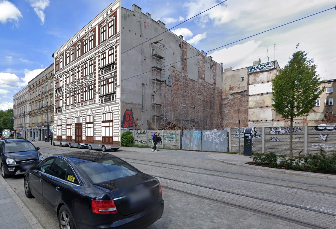 change the cartoon facade of the tenement house in the existing image to a photorealistic facade
