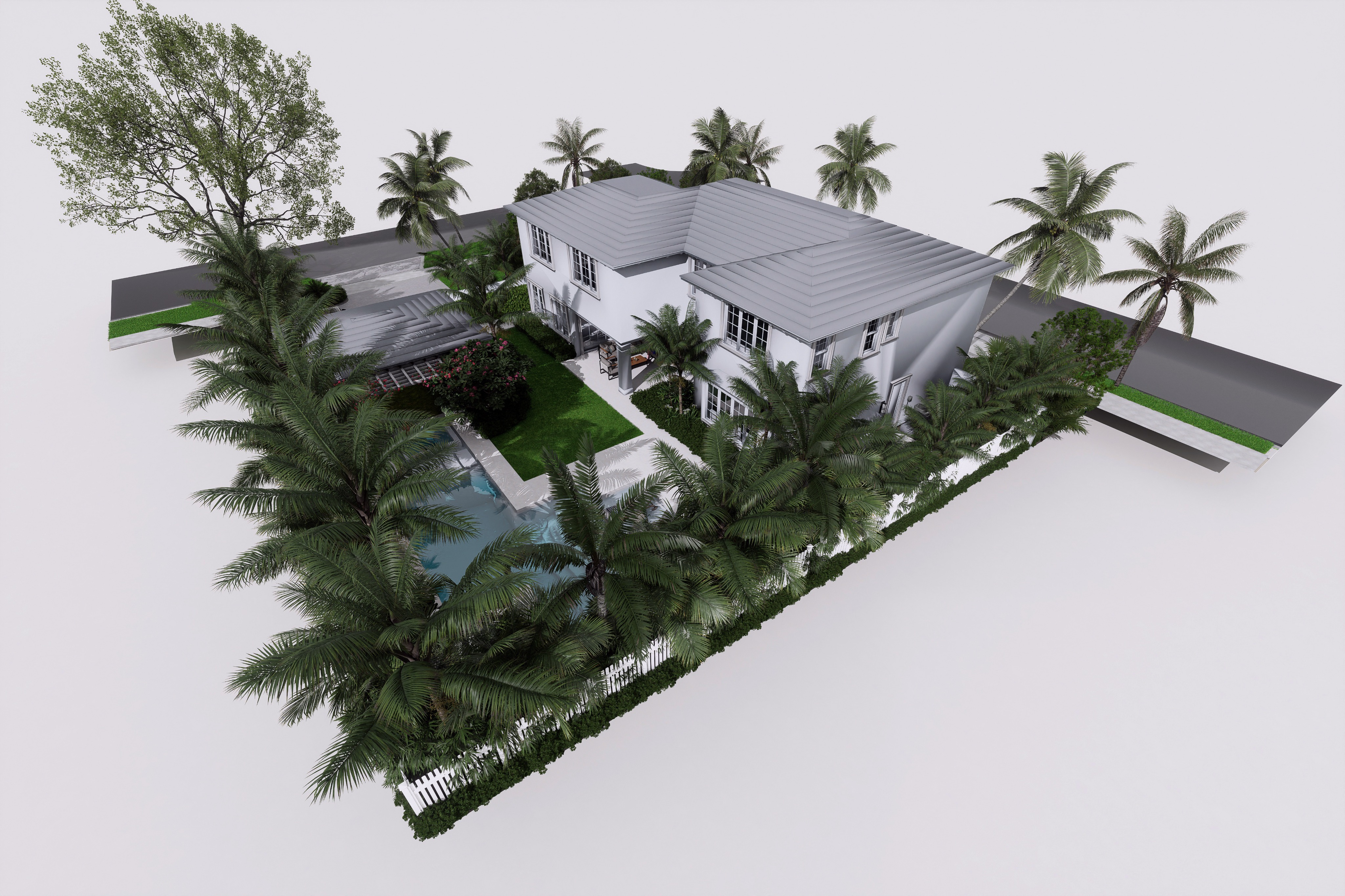 enhance only textures and finishes of the trees palms lawn people etc and make the ground plane white while leaving the blue sky texture