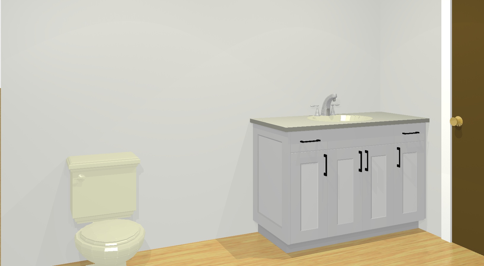 render a serene and elegant bathroom with a modern aesthetic the walls are painted a soft light gray to create a calming atmosphere the cabinets are a chic muted dove gray featuring sleek black handles for a touch of contrast the countertops are a smooth glossy dark laminate reflecting a gentle light install a polished silver faucet at each basin for a contemporary flair the flooring is warm natural light wood adding a cozy and inviting feel the door is a rich dark oak exuding warmth with a subtle brass knob the overall ambiance is tranquil and upscale with soft lighting enhancing the soothing tones and textures there are vanity lights and mirrors on all the walls with a sit down makeup top between the two vanities