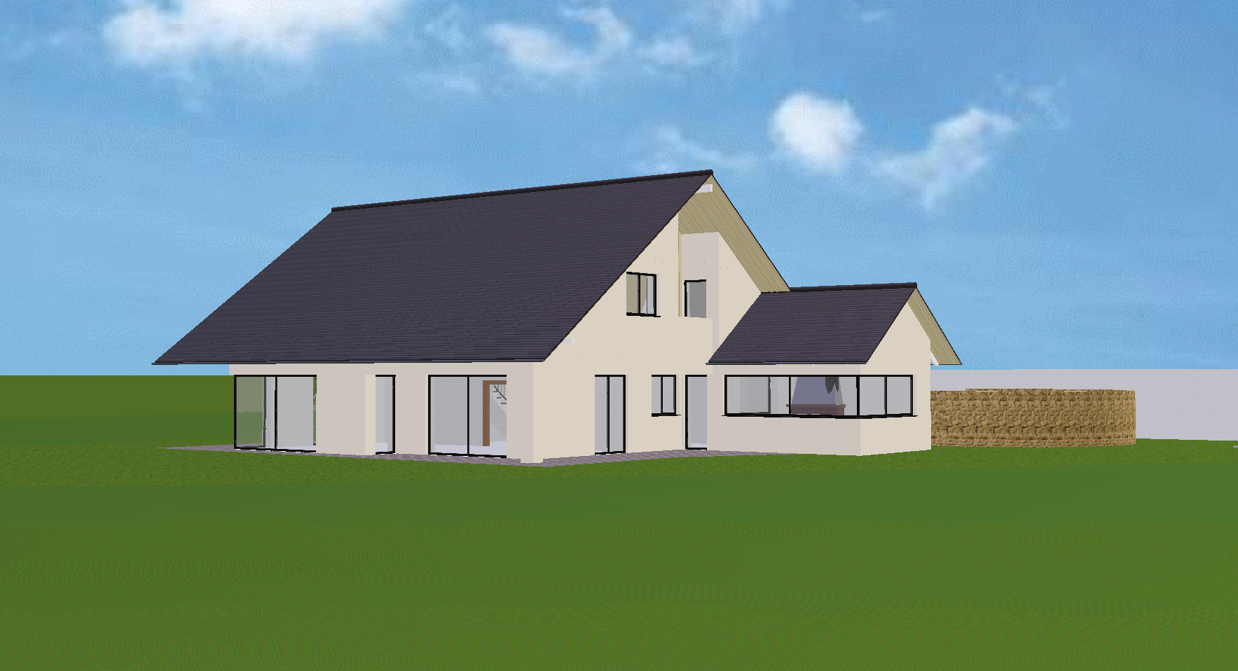 genau dieses rendering berarbeiten fotorealistisches foto exakt dieselbe perspektive und kameraposition wie das hochgeladene referenzbild 100 identische geometrie exakt gleiche anordnung exakt identische fensterpositionen mit gleichem ausblick durch die fenster weiches nat rliches tageslicht leicht schr g einfallende sonne durch die fenster alle r ume hinter den fenstern k nstlich ausleuchten sanfte realistische schatten realistische materialien echte texturen hochwertige oberfl chenreflexionen echte menschen pflanzen mit echten b umen und str uchern ersetzen gr ne fl chen mit wiese rasen und einigen b schen ersetzen sehr realistische umgebung belebte szene mit menschen gr sse der erwachsenen menschen etwa 1 80 meter und proportional zum haus nat rlicher himmel mit leichter bew lkung nat rliche farbwiedergabe leicht warme farbstimmung golden hour feeling blickrichtung ist nach norden sonnenlicht kommt von westen f ge subtile atmosph rische effekte hinzu wie leichten staub in der luft oder nat rliche farbvariationen ohne die urspr ngliche szene zu ver ndern das bild muss wie eine professionelle fotografie aussehen es soll ein echtes und reales foto sein canon eos r5 35 mm festbrennweite f 2 8 hyperrealistisch dslr qualit t raw aufnahme 8k aufl sung extrem scharf perfekte tiefensch rfe professionelle architekturfotografie