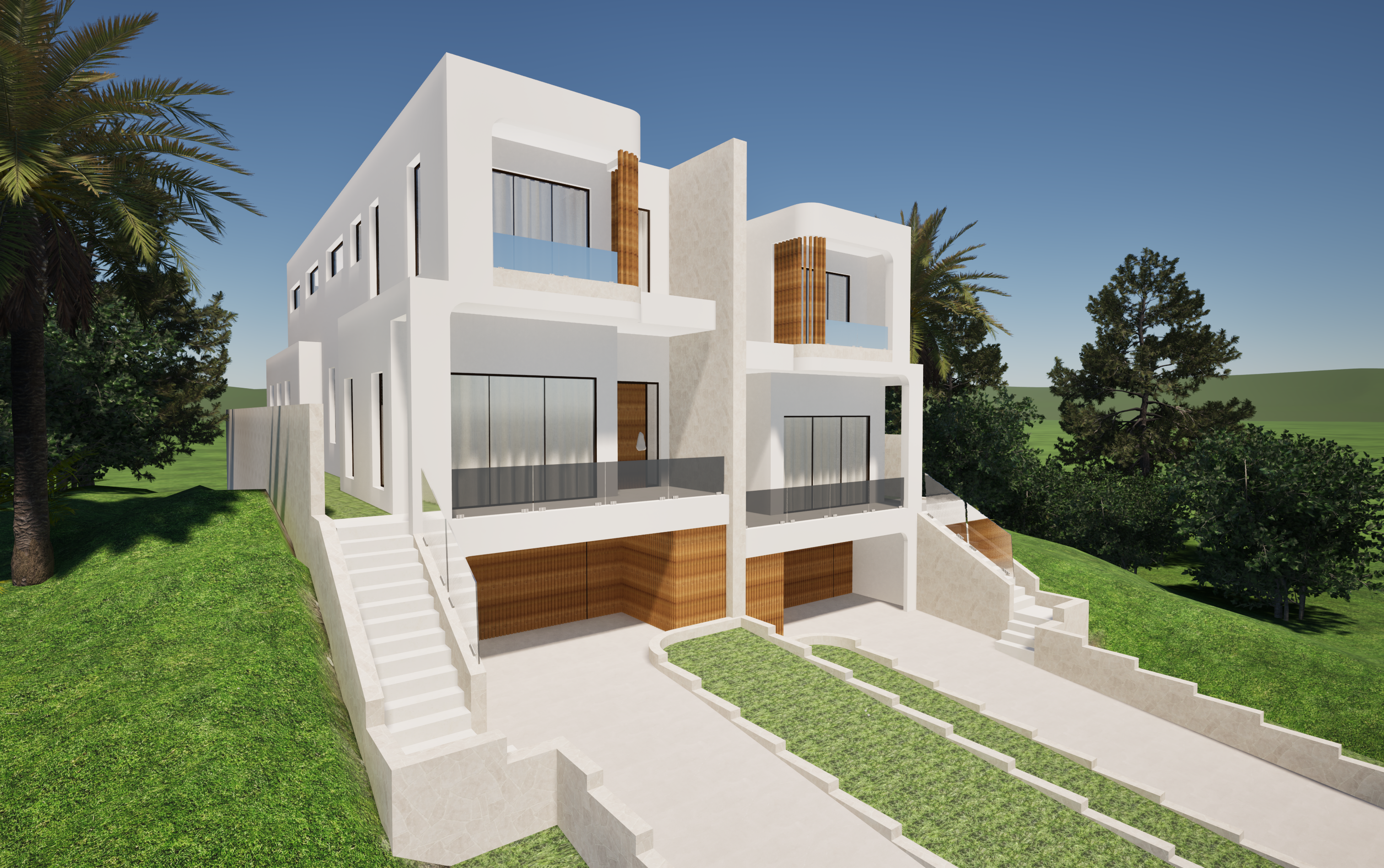 do not change any shapes forms geometry or proportions do not add any new elements no buildings objects furniture vegetation or details do not remove any existing elements do not remove or alter any glass railings balustrades do not modify replace or reinterpret materials or textures only allowed adjustments improve realism only adjust lighting shadows reflections and surface realism material type colour and placement must remain identical add more trees to make look fuller no creativity no improvisation no assumptions final render must match the original model exactly with realism improvements only