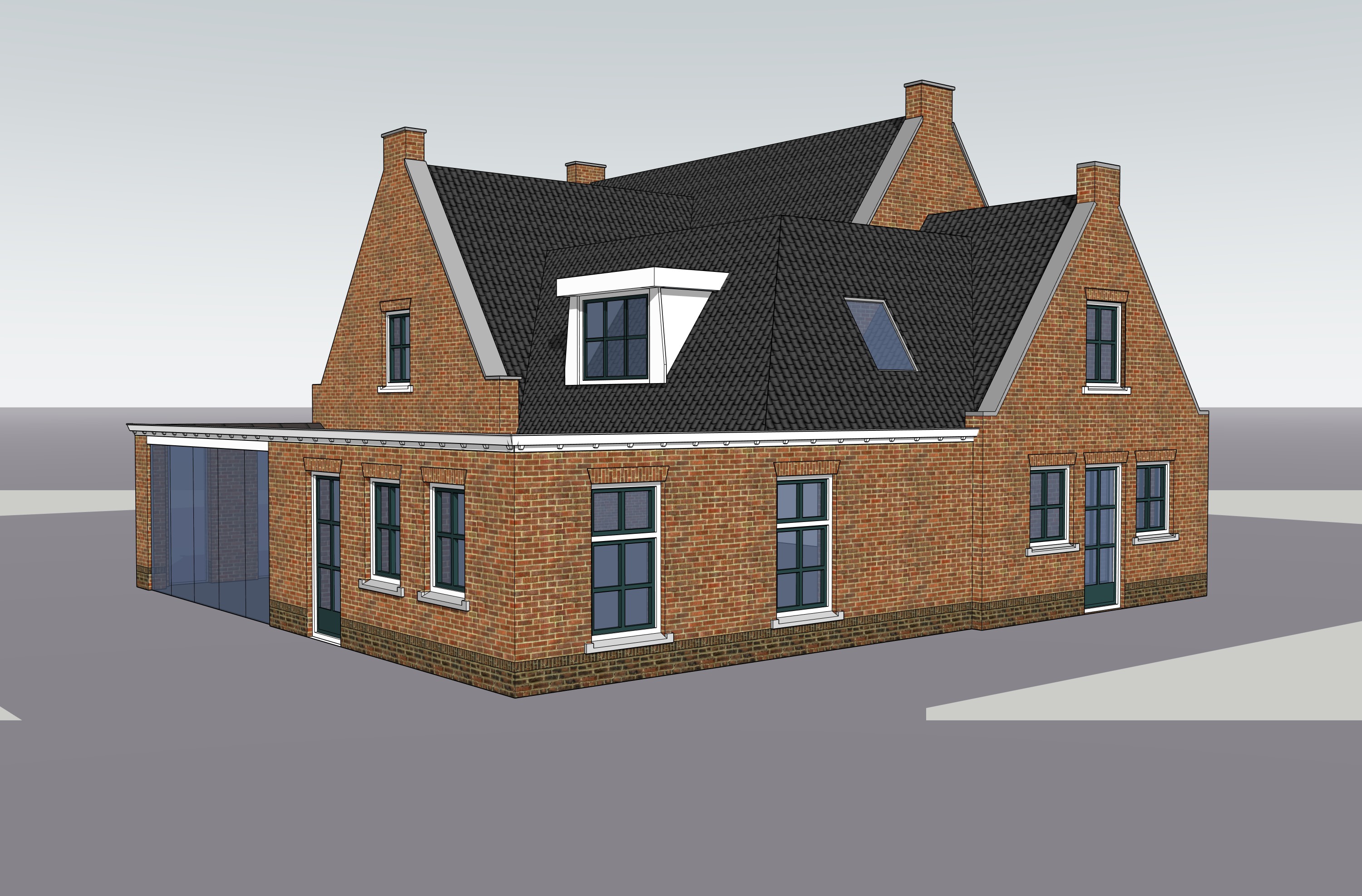 this villa is surrounded by a garden with trees grass flowers and people the weather is sunny with a few clouds keep the materials and colours of the house the same as in the original there is a terrace with garden furniture in front of the big glass veranda ini de left side of the picture
