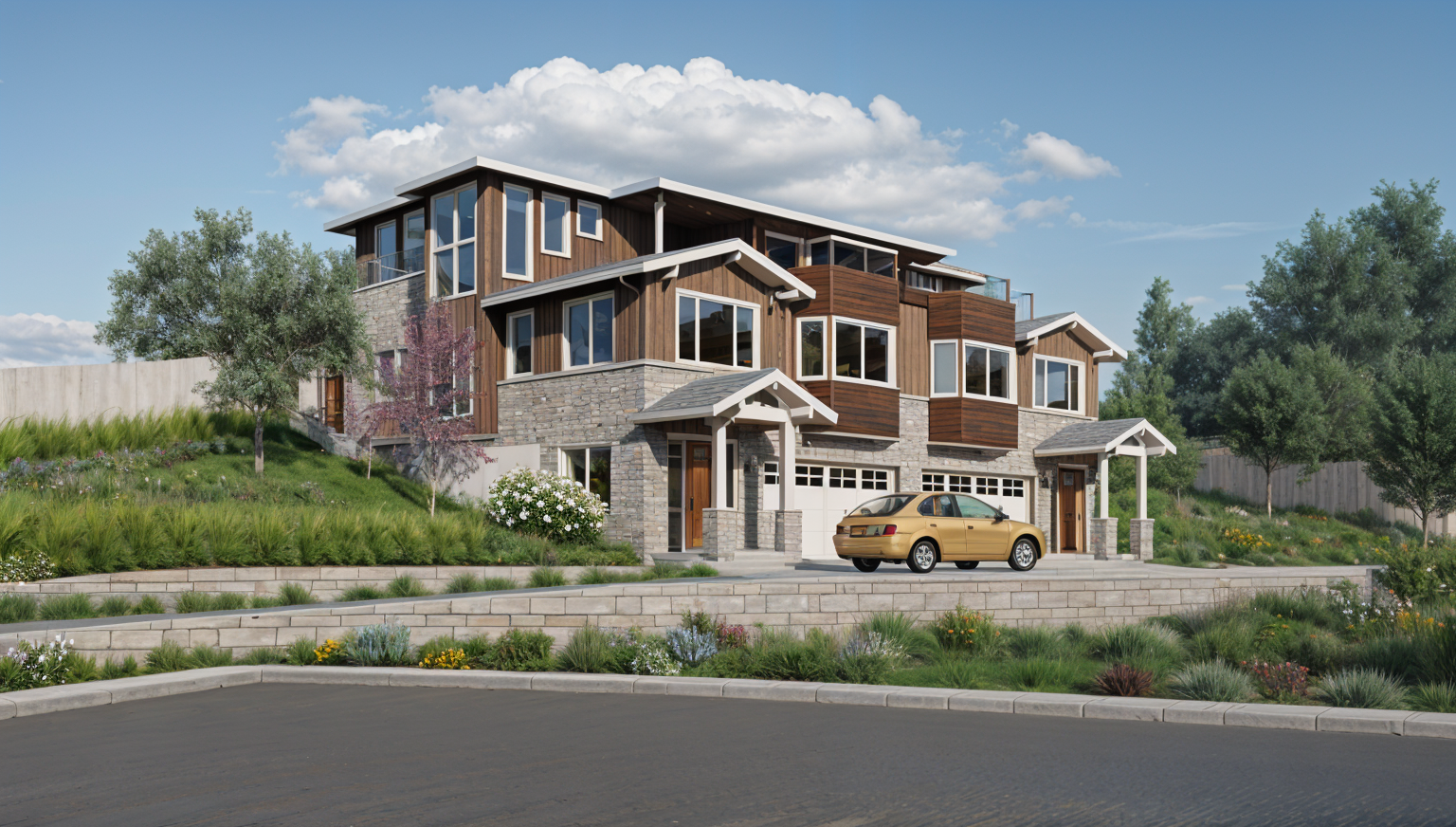 enhance the scene with photorealistic materials and keep the original colors the atmosphere should be serene and inviting with a bright blue sky filled with soft fluffy clouds add low lying landscape native shrubs in green areas