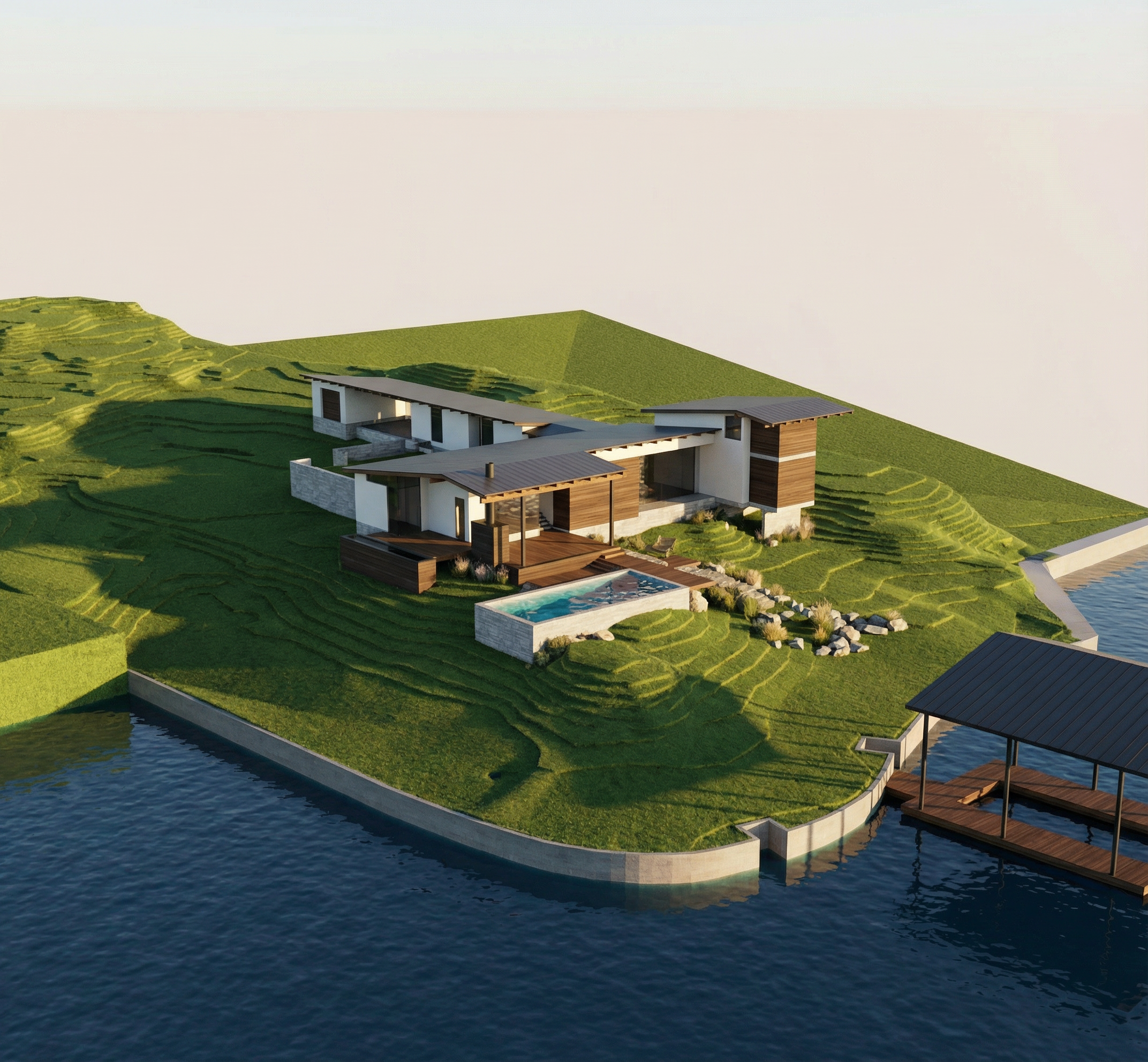 clean mountain modern timber architectural exterior rendered in cinematic vibrant dawn lighting with vibrant blue skies and fluffy white clouds mountain modern with heavy timber architectural style select grade horizontal cedar wood siding beautifully lush green manicured landscape around structure with hedges and gardens black standing seam metal roof prominent cinematic rolling green and yellow hills with trees in the distance in the background high fidelity photorealistic visualization crisp shadow falloff refined facade geometry soft atmospheric depth premium architectural photography mood ultra clean composition and materials dark trim around windows