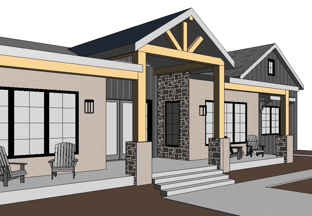 a modern farmhouse with rolling hills in the background black windows stacked limestone stained light brown cedar accents very dark gray fascia and vertical tongue and groove siding black standing seam metal accents dark gray asphalt shingle roofing layered california native planting