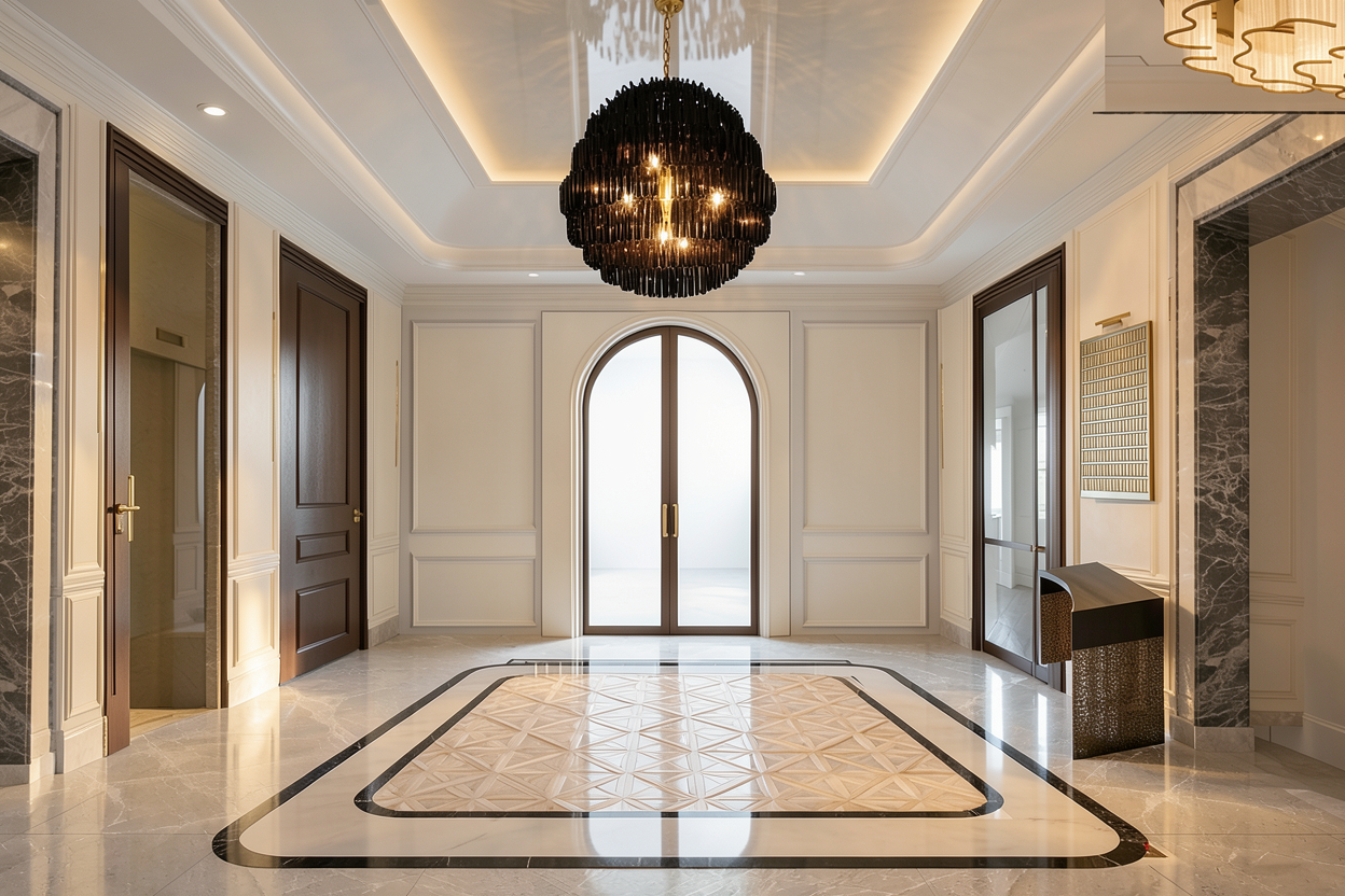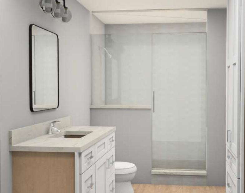 update the bathroom finishes with the following specifications change the main bathroom floor tile to a 24x24 format using happy floors macael blanco matte ensure accurate scale a clean grid layout and minimal grout joints for a modern seamless appearance update the shower wall tile to happy floors stratus grigio in a 12x24 format install the tile vertically with a 50 offset running bond pattern maintaining consistent spacing and alignment ensure all materials are scaled correctly and transitions between floor and shower are clean and well defined maintain realistic lighting texture and surface variation so the materials appear natural keep the overall design cohesive modern and high end in appearance