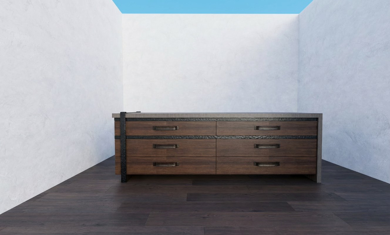 render this in a more photo realistic way the top is a medium greyish wood the drawers are a dark walnut wood there is an accent strip of blackened hammered iron metal across the front do not change the materials or add anything lighten it up a little