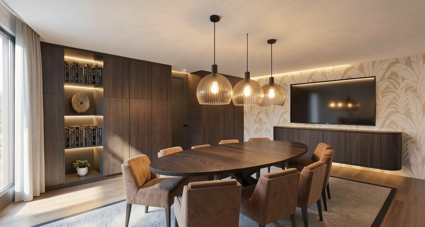turn 3d into realistic render turn the lights on above the table and led strips in the cupboard there is natural light coming from the left through large windows you can t see there is no led strip on the ceiling