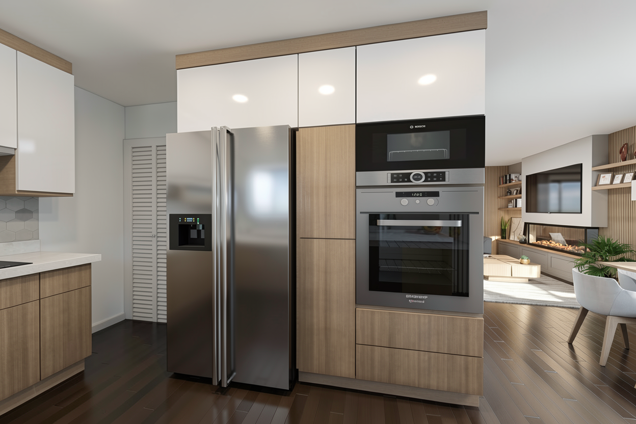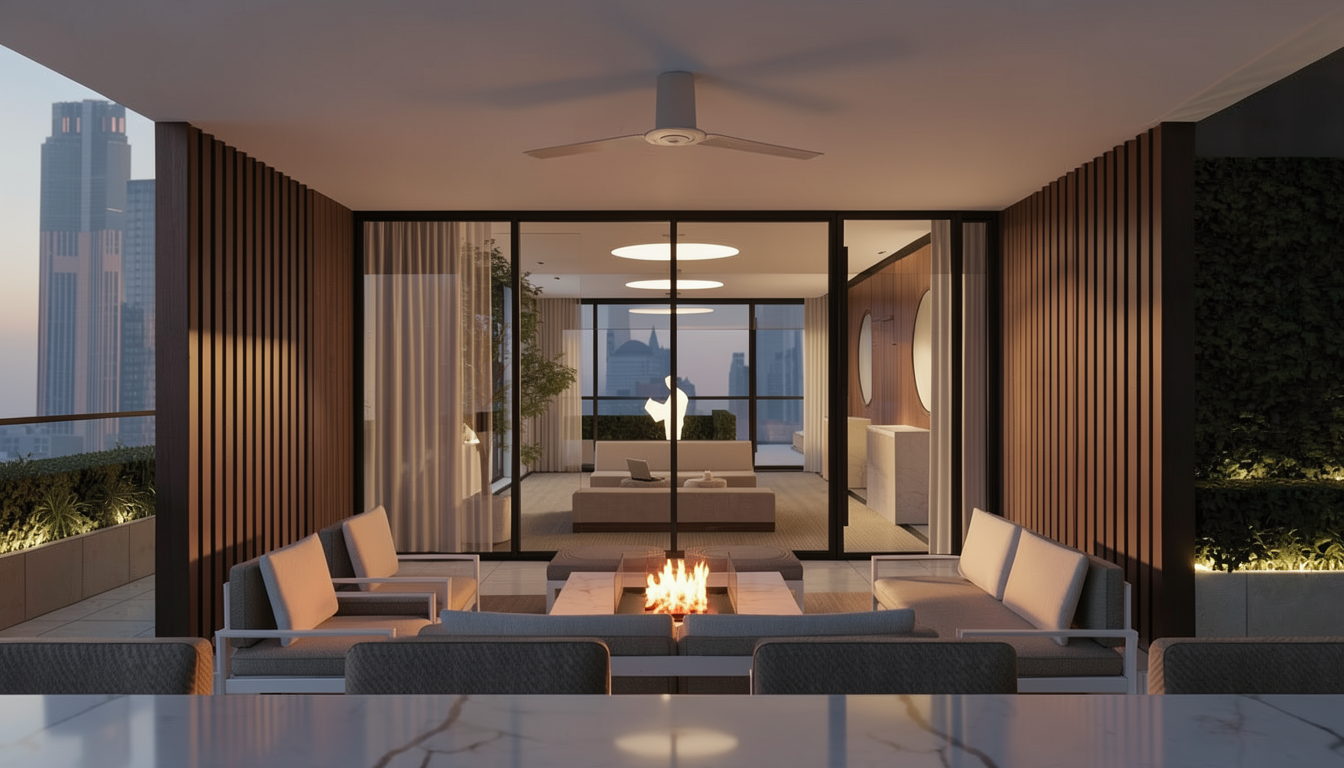 render a fully photorealistic contemporary outdoor terrace at golden hour transitioning into early evening maintain the exact architectural geometry layout furniture placement glass doors ceiling fan wood slat walls green wall panels and city skyline view do not modify proportions materials or camera perspective scene overview a modern terrace framed by vertical walnut wood slat walls on both sides integrated living green walls and large black steel framed sliding glass doors opening into an interior lounge in the foreground is a marble countertop edge centered on the terrace is a low rectangular fire table surrounded by modular outdoor lounge seating with slim metal frames and neutral woven cushions the city skyline rises in the background lighting atmosphere golden hour exterior lighting warm golden hour sunlight grazing the vertical wood slats emphasizing texture and depth soft long shadows across the terrace flooring city skyline softly lit with warm ambient glow slightly hazy atmosphere for depth fire feature realistic dynamic flame within a modern rectangular fire table warm orange glow reflecting subtly onto the marble surface and nearby cushions soft flickering light on adjacent metal frames interior through glass warm interior lighting visible through the sliding doors 2700k 3000k ceiling circular light features softly glowing subtle reflections on the glass panels sheer curtains softly illuminated green walls lush dense vertical greenery with natural tonal variation slight shadow depth between foliage layers soft uplighting at base for subtle nighttime ambiance materials realism wood slats rich walnut tone vertical grain satin finish outdoor seating light taupe woven fabric with visible texture and soft cushion creases metal frames brushed aluminum or powder coated matte white fire table light stone or marble surround with subtle veining flooring large format light porcelain or limestone pavers matte finish glass doors dark bronze or black steel frame with realistic reflections and transparency marble foreground surface soft polished finish with natural veining and slight reflectivity change figure in background to realistic person make cushions softer and fuller wood slats are 1 inch by 6 inches only and light would pass in between