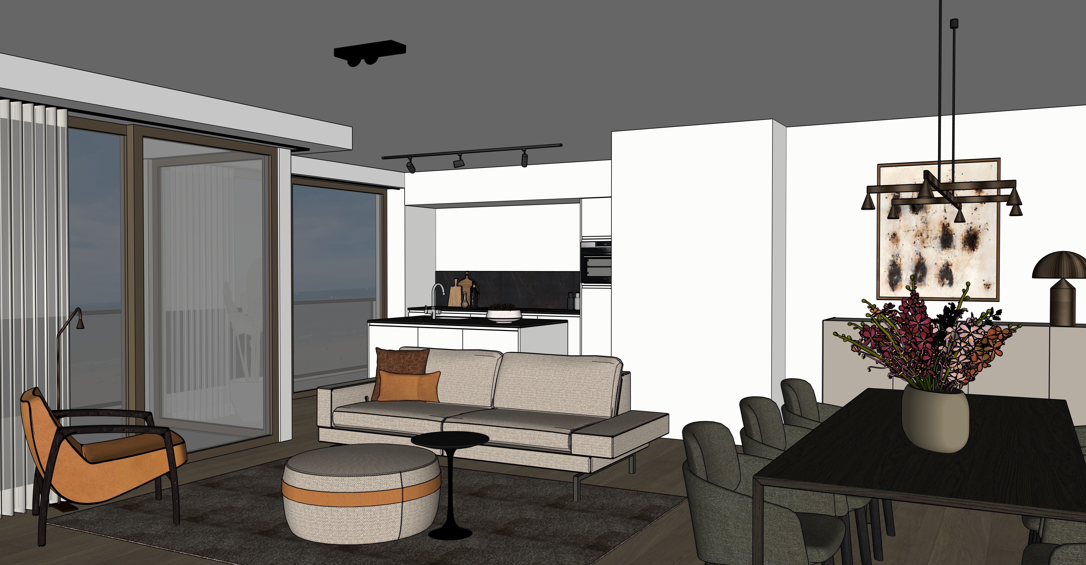 realistic interior shot natural warmer daylight sea and beach view floor is light oak maintain textures and colors dressoir in matt lacquer brown beige plain carpet slightly darker lamps are softly on keep flowers on table
