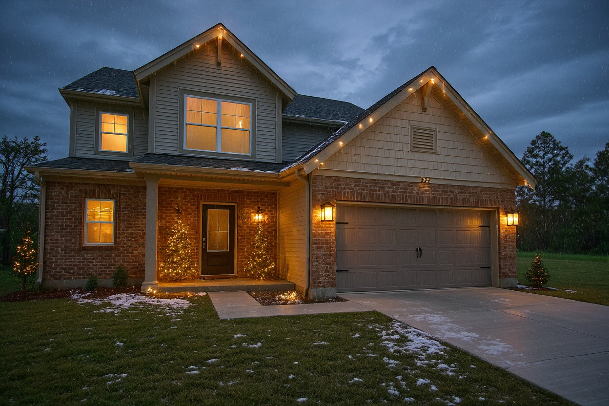 decorate this home exterior for christmas without altering the home or background in any way do not add or remove trees structures shadows vehicles snowbanks or any other elements only add small realistic holiday d cor directly onto the home itself keep the image exactly in its original framing and perspective maintain mid day lighting with snow on the ground and roof and include falling snow