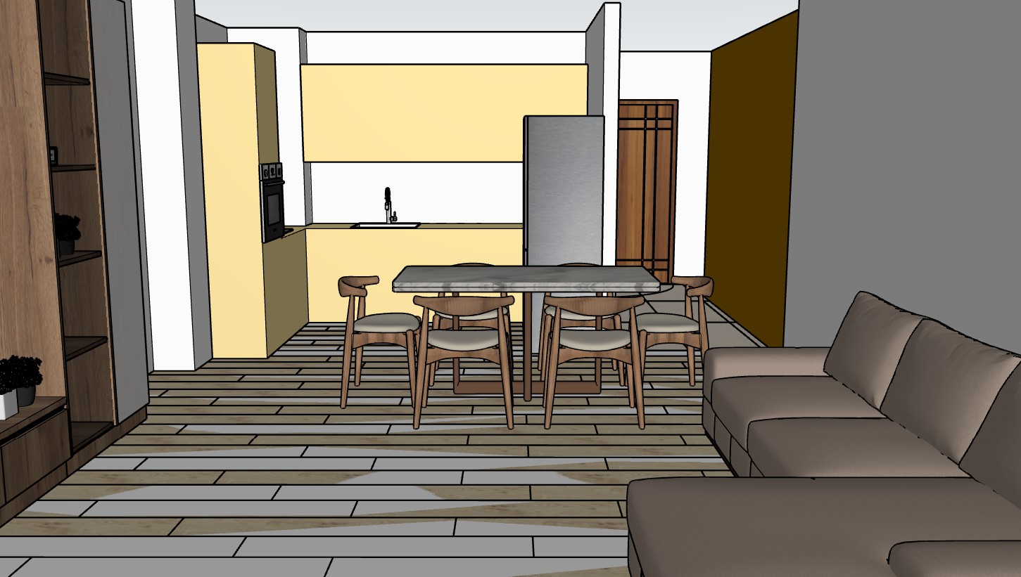 interior shot keep the same angle kitchen in beige add accesories in the kitchen and in thge room put ceiling lights modern half pendants sofa is cotton beige two pendant lights above the dining table modern design