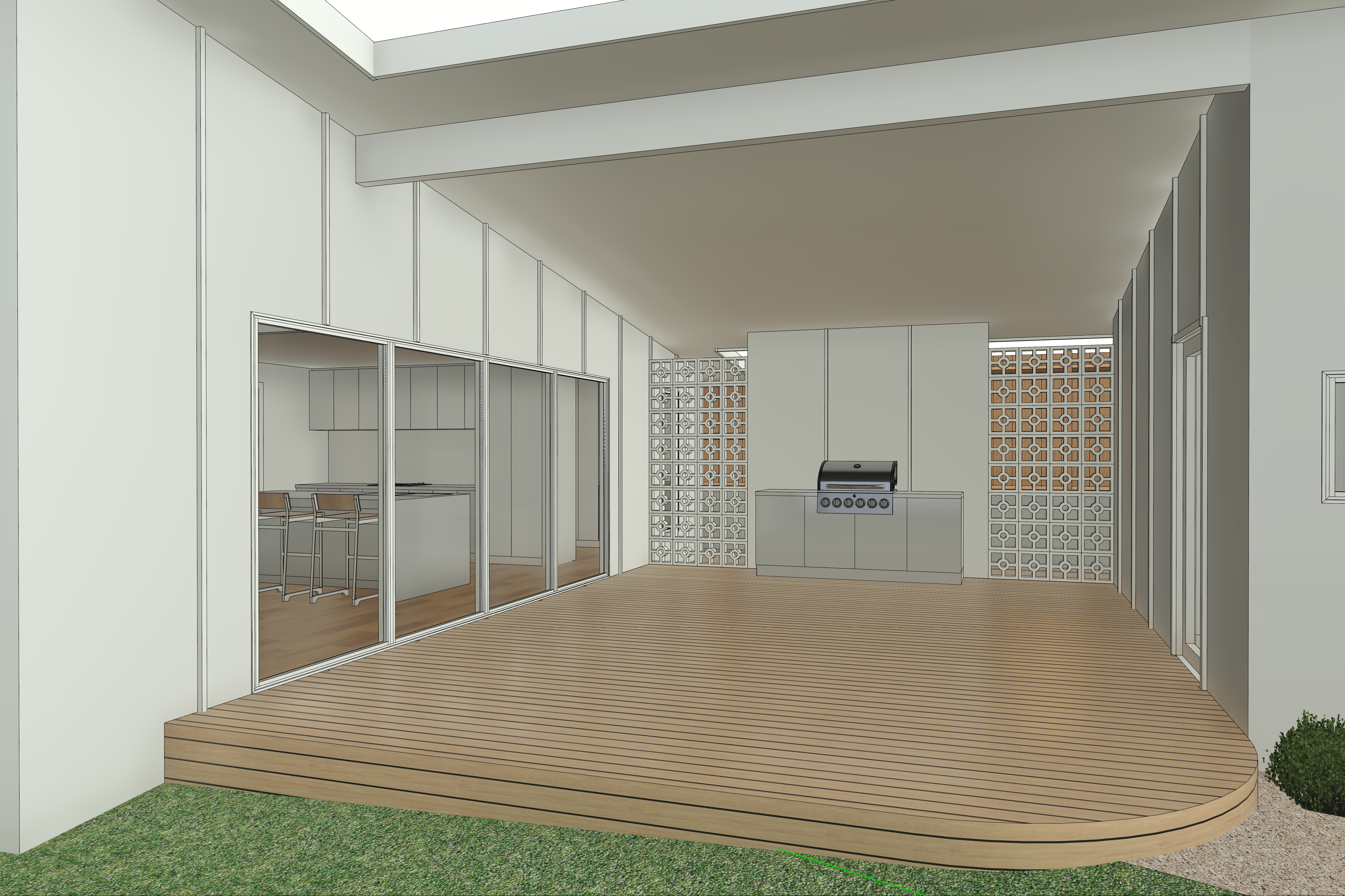 render a beautifully lit modern outdoor courtyard featuring a sleek white paneled exterior wall with large glass sliding doors the deck is made of smooth light brown wood planks contrasted by a lush vibrant green lawn in the background a stylish gray and white patterned privacy wall creates a geometric aesthetic the outdoor kitchen includes a modern stainless steel grill adding a metallic shine the atmosphere is serene and contemporary with soft natural light casting gentle shadows highlighting the clean lines and open space