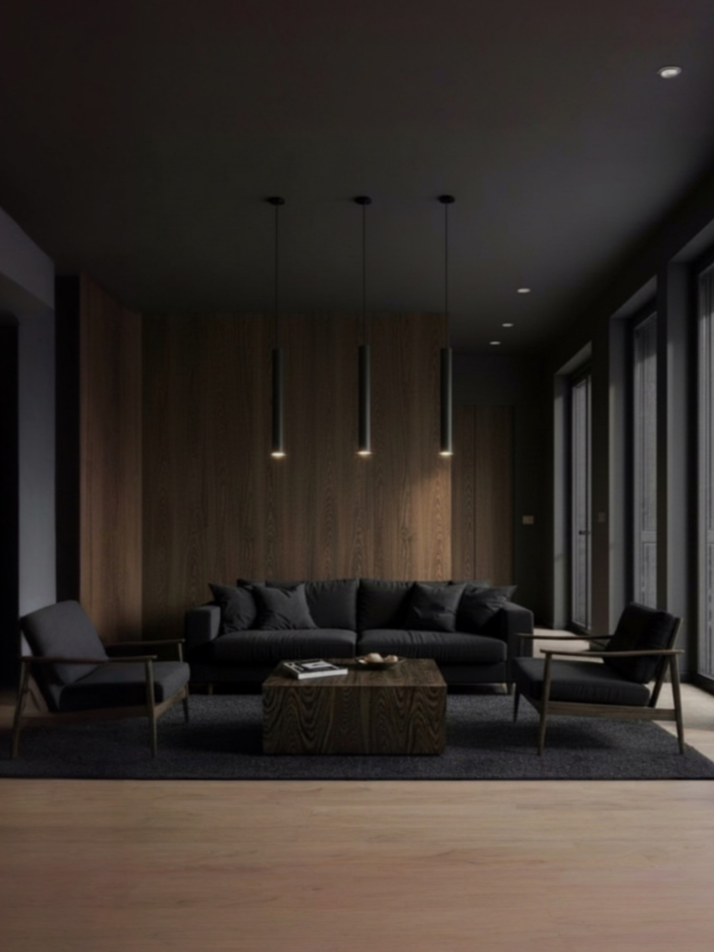 make left white wall match the timber panelling and add black curtain to left side wall opening