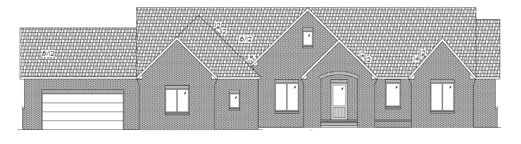 modernist exterior shot make house light red brick with white paint splotches make windows white put house on grassy field make roof dark gray architecture