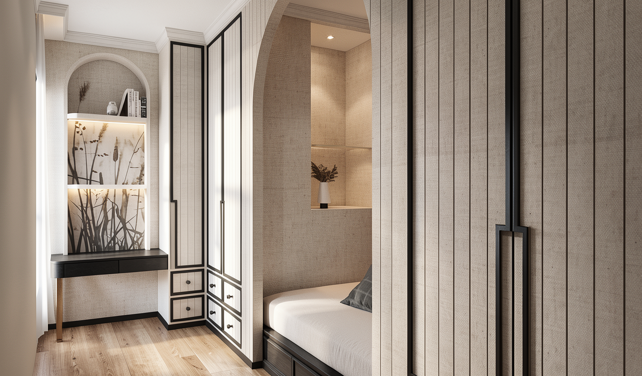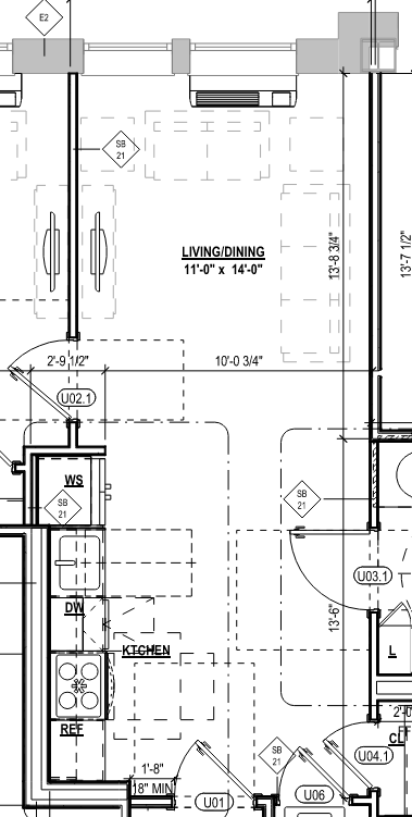 render this apartment with a view point looking towards the kitchen the space should feel light and bright with a traditionl yet modern vibe the kitchen cabinets should be a pale grey kitchen with shaker stile cabinet doors stainless steel fixtures and appliances and light oak flooring walls should be painted white and wall base should be glossy white