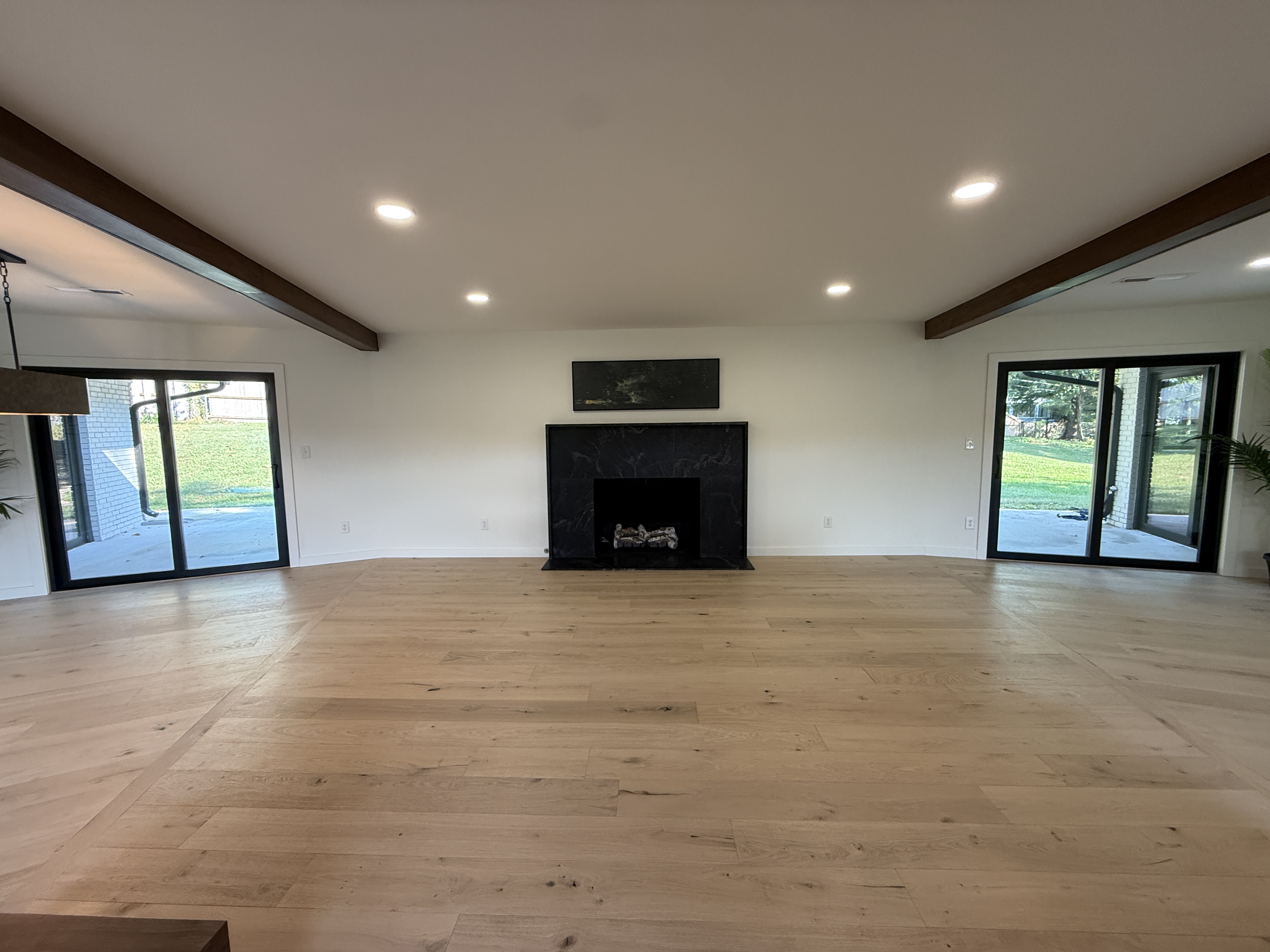maintain all current aspects of the room do not change anything only add forest green modern couches and a black baby grand in the back right corner