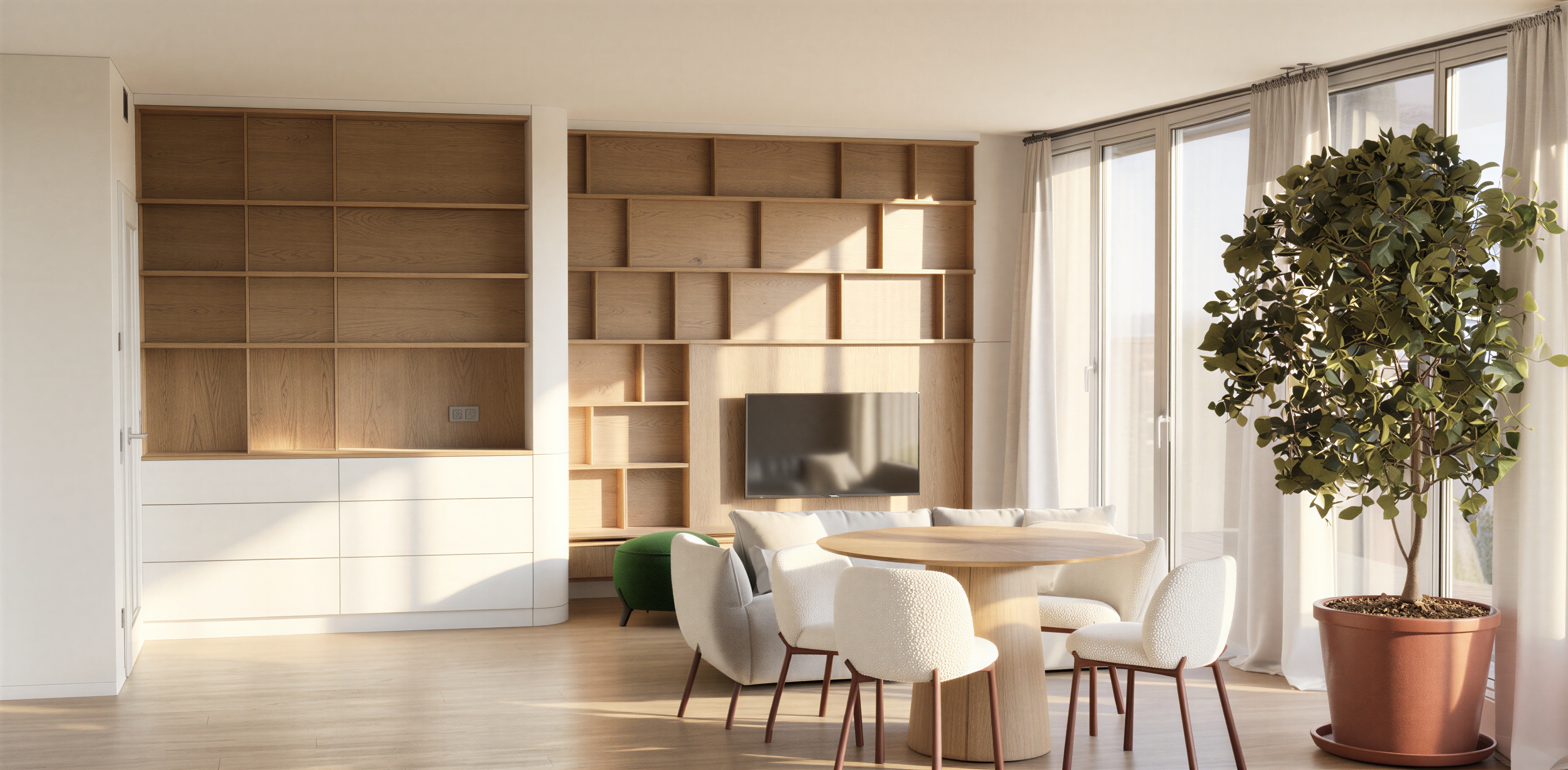use the provided image strictly as the base image do not change the camera angle layout furniture placement architecture proportions materials or colors only improve the atmosphere realism and subtle styling of the interior enhance the lighting to create a warm natural late afternoon atmosphere with soft sunlight and realistic interior light bounce while keeping the lighting believable and not overly dramatic add subtle interior decoration to make the space feel more lived in and cozy but keep the styling minimal and tasteful add a soft warm led strip light underneath the shelves in the wooden tv wall unit on the right side the led light should be integrated and subtle softly illuminating the shelves and wood texture decorate the open shelves with a few carefully placed objects such as a small stack of booksa couple of minimal ceramic vasesa small decorative objectplace an open magazine on the dining table naturally positioned as if someone was just reading it keep the styling minimal elegant and consistent with a modern scandinavian interior focus on improving realism atmosphere lighting quality and subtle decoration while keeping the original design intact