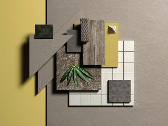 create a digital collage featuring a modern design with geometric shapes arranged symmetrically small living room apartment with small windows use soft muted colors a warm taupe background rich olive green leaf accents and a subtle mustard yellow panel include textured stone like surfaces and wood grain patterns elements should have a smooth finish for a contemporary look the atmosphere should convey calmness with a hint of nature