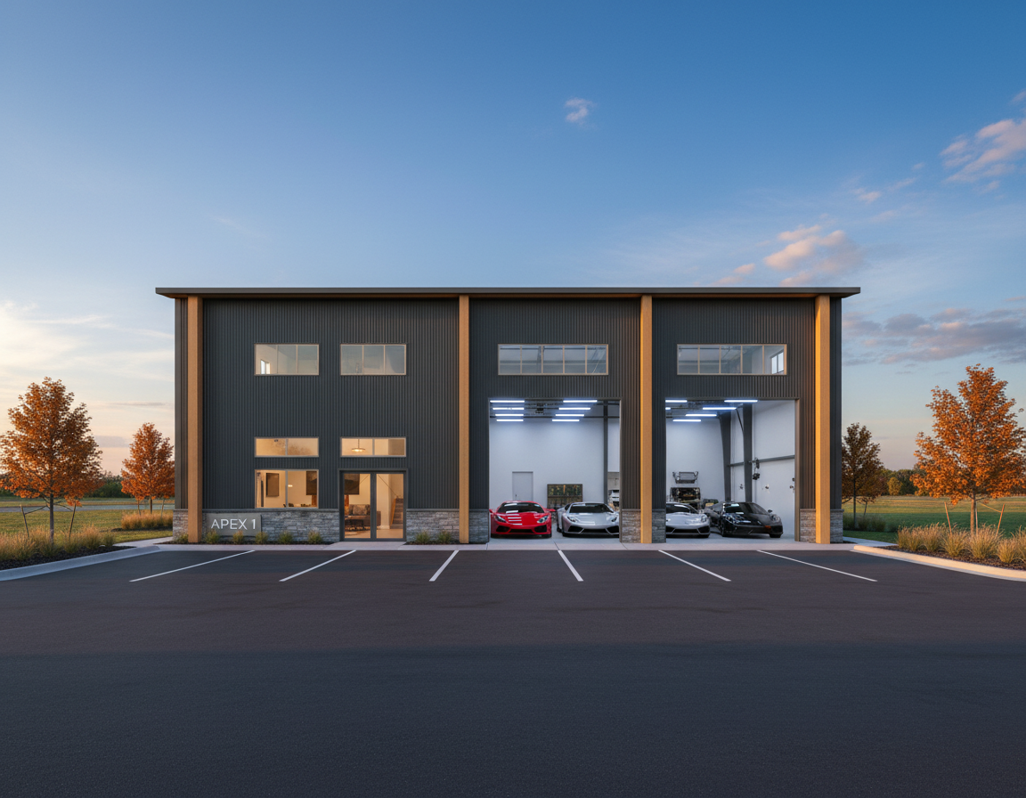 this is a luxury garage condo glass garage doors high end exterior and interior finishes and sports cars on the garage side on the left liveable side a modern interior showing through the windows make the lighting in the garage led and the lighting in the liveable side a bit warmer sunset and the development name is apex 1 i would like to see the elevation from 100 yards backand from the side in summer and have a paved area in front of the garages have the cars be a mixture of current and vintage corvettes have the apex 1 be large and in between the upper windows and lower windows on the residential side no parking stalls and on the liveable side a concrete path with a patio with a modern fire pit