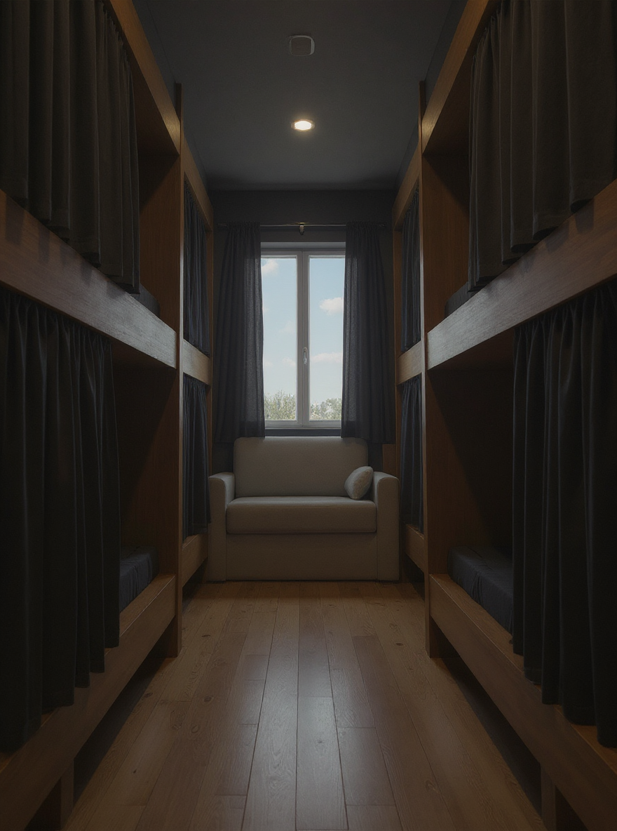 please render this photo exaclty its from sketchup a hallway of a tour bus dark grey walls black curtains forr the bunks lookigntowards thebacfk lounge area
